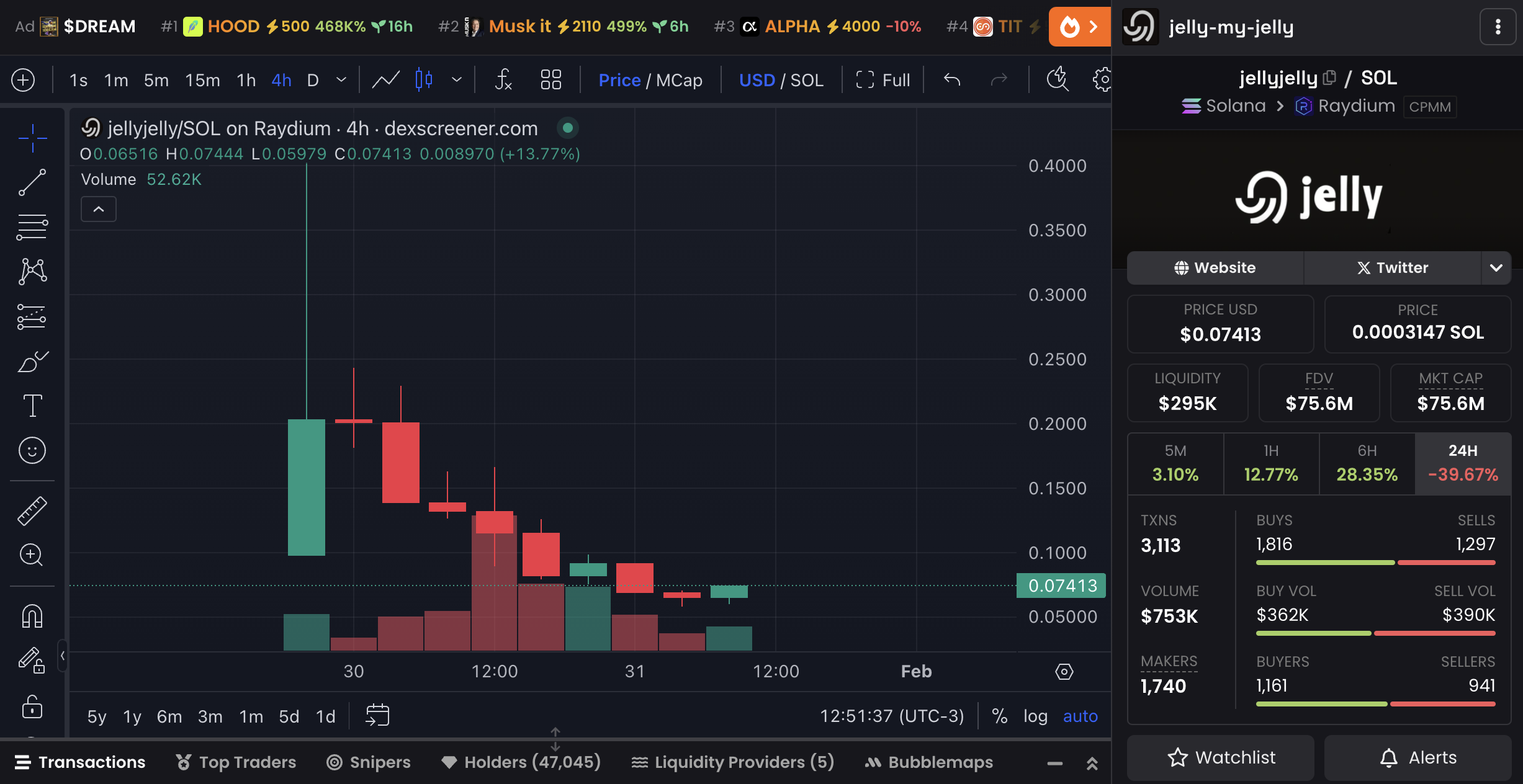 Sa loob ng wala pang dalawang araw, nakakuha ang JELLYJELLY ng mahigit 47,000 holders, na may daily volume na $753,000 at 3,100 transactions. Ang market cap nito ay halos umabot na sa $77 million, na nagpapakita ng malakas na initial interest kahit na medyo mababa pa ang transaction activity.