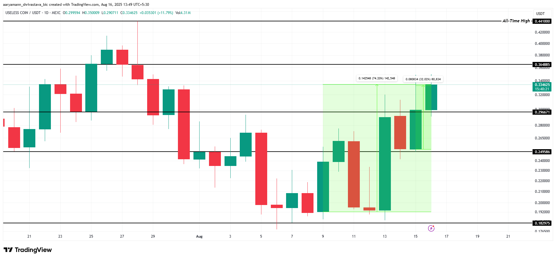 Ang Useless (USELESS) token, na nangunguna sa bonk.fun tokens, ay tumaas ng 32% sa nakaraang 24 oras, dagdag pa sa 74% pagtaas ngayong linggo. Nananatili ito sa ibabaw ng $0.296, at tinutulak ang token papunta sa $0.364. Ang patuloy na pag-angat ay nagpapakita ng pagtaas ng interes ng mga investor, at ang token ay nakikinabang sa recent bullish activity sa merkado.