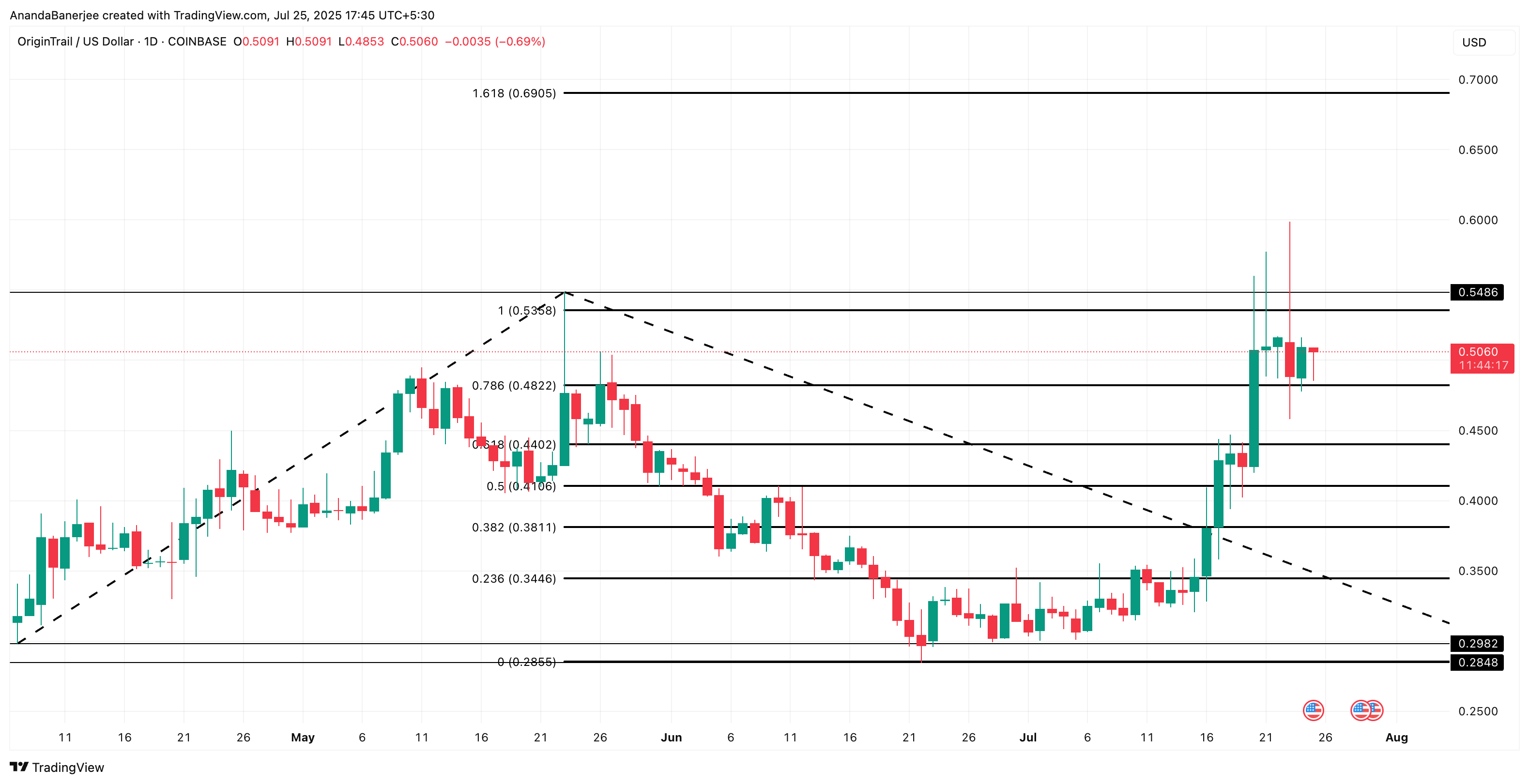 Sa price chart, kamakailan lang na-break ng TRAC ang $0.48 resistance at ngayon ay nasa paligid ng $0.50. Kung malampasan nito ang $0.53 (isang level na dati nang na-reject), ang Fibonacci extension chart ay nagpapakita ng mga target sa itaas na $0.69 (ang 1.618 Fib extension).