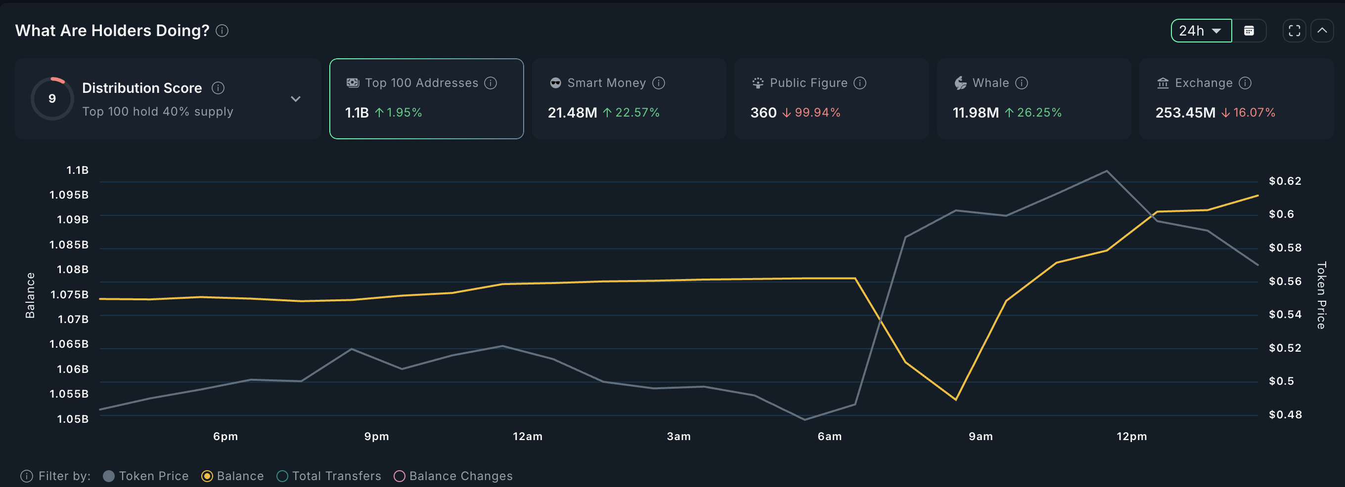 Mula sa dashboard ng Nansen, tumaas ng 1.52% ang whale holdings sa nakaraang 7 araw sa 487.98 million ZBCN, habang ang smart money holdings ay tumaas ng 7.84% sa 50.51 million. Ang mga inflows na ito ay nagpapahiwatig ng tahimik na pag-ipon ng mga malalaking investors. Tumaas din ng 4.61% ang public figure wallets. Samantala, bahagyang bumaba ang exchange balances sa 21.14 billion, na nagpapahiwatig ng nabawasang sell pressure.