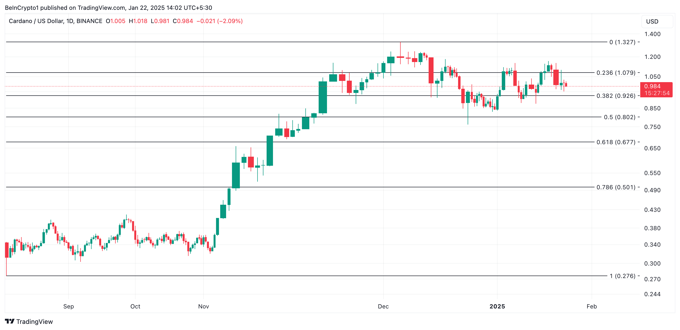 Ang ADA ay kasalukuyang nagte-trade sa $0.98, na bahagyang nasa itaas ng support level nito na $0.90. Kung lalakas pa ang bearish pressure, puwedeng i-test ng presyo ang support na ito. Kapag hindi nag-hold sa $0.90, puwedeng bumaba pa ang ADA, posibleng umabot sa $0.80.