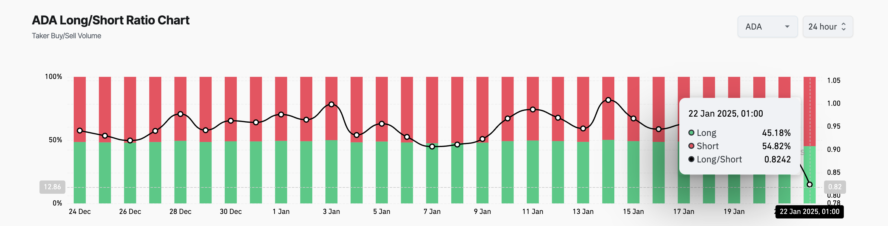 Ang Long/Short Ratio ng isang asset ay ikinukumpara ang dami ng long (buy) positions sa short (sell) positions sa market. Tulad ng sa ADA, kapag ang ratio ay mas mababa sa isa, mas maraming trader ang nagbe-bet na bababa ang presyo (shorting) kaysa tataas. Kung patuloy na mangibabaw ang short sellers, puwedeng tumaas ang downward pressure sa presyo ng asset.