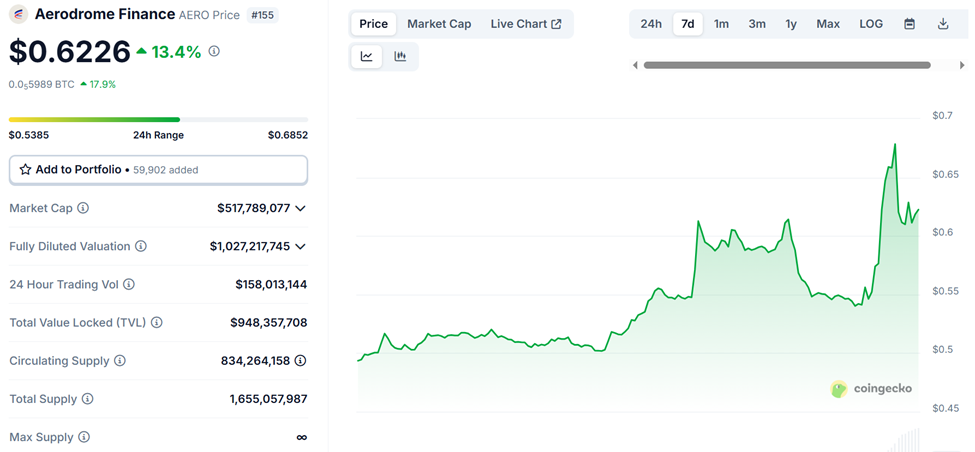 Nagkaroon ng pagtaas matapos makumpirma ang malaking bagong integration ng Base chain DEX services direkta sa kanilang main app, na naglalagay sa Aerodrome bilang pangunahing player.
