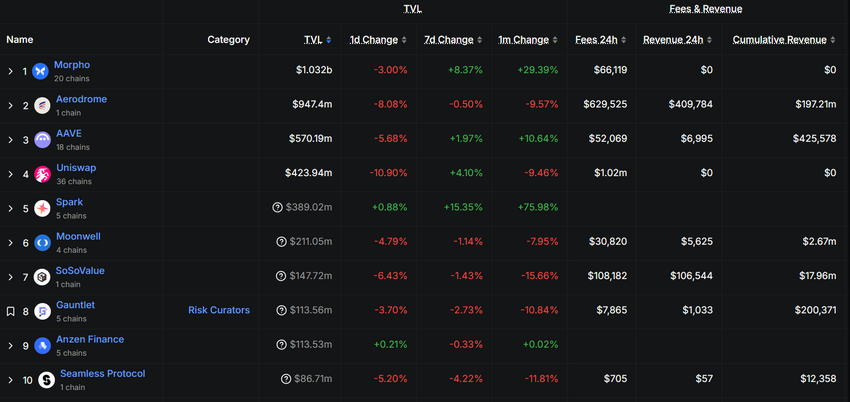 Ipinapakita ng data sa DefiLlama na ang TVL ng Morpho ay nasa $1.032 bilyon, mas mataas kaysa sa Aerodrome. Ang Morpho protocol ay nagpapabuti ng lending efficiency sa pamamagitan ng direktang pag-match ng liquidity, na nagpapaganda ng interest rates.