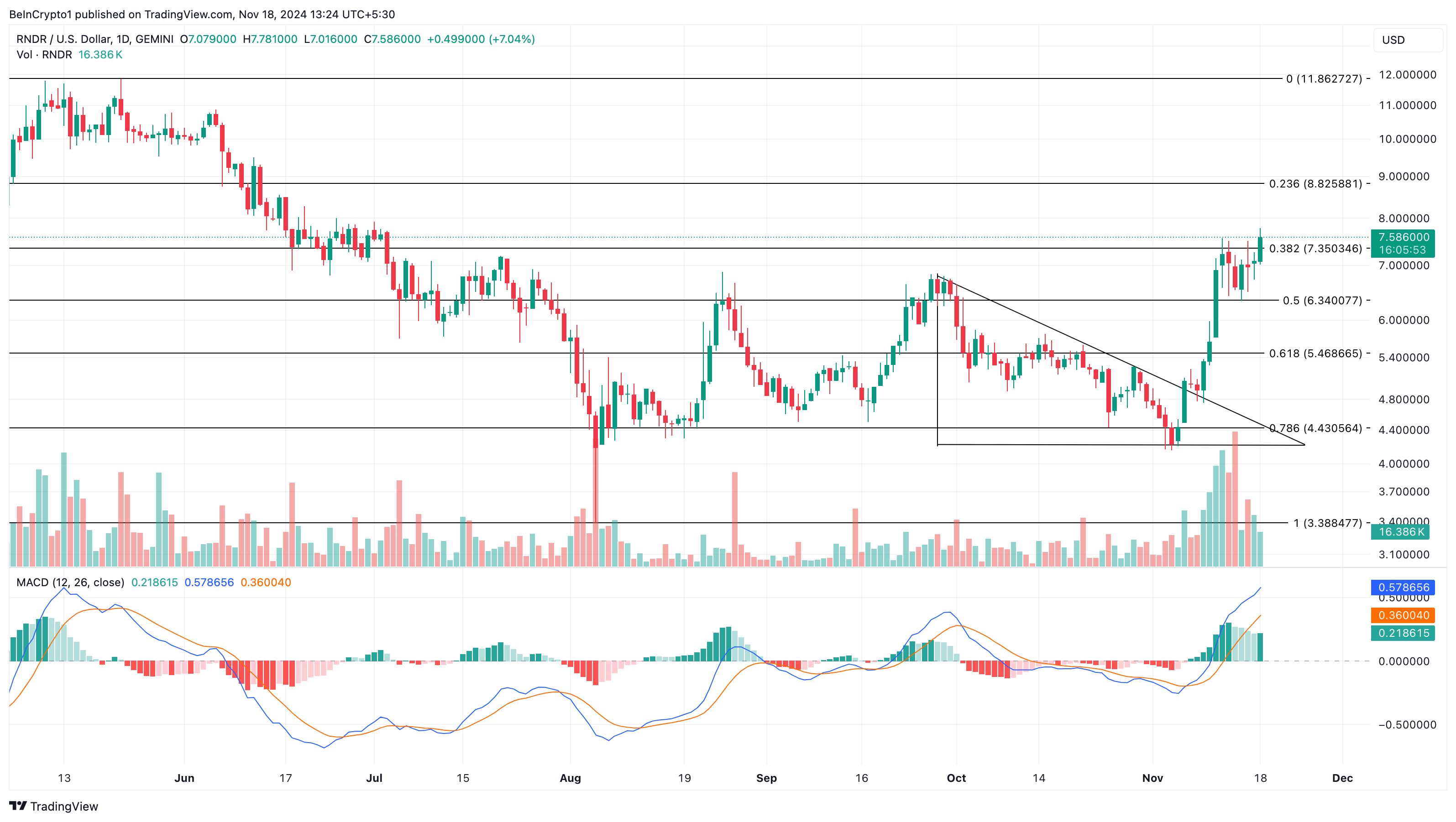 Subalit, pagkalabas ng report, bumagsak ang presyo ng cryptocurrency. Ngayon, ang presyo ng RENDER, na kasalukuyang nasa $7.59, ay tumaas ng 27% sa nakalipas na pitong araw.