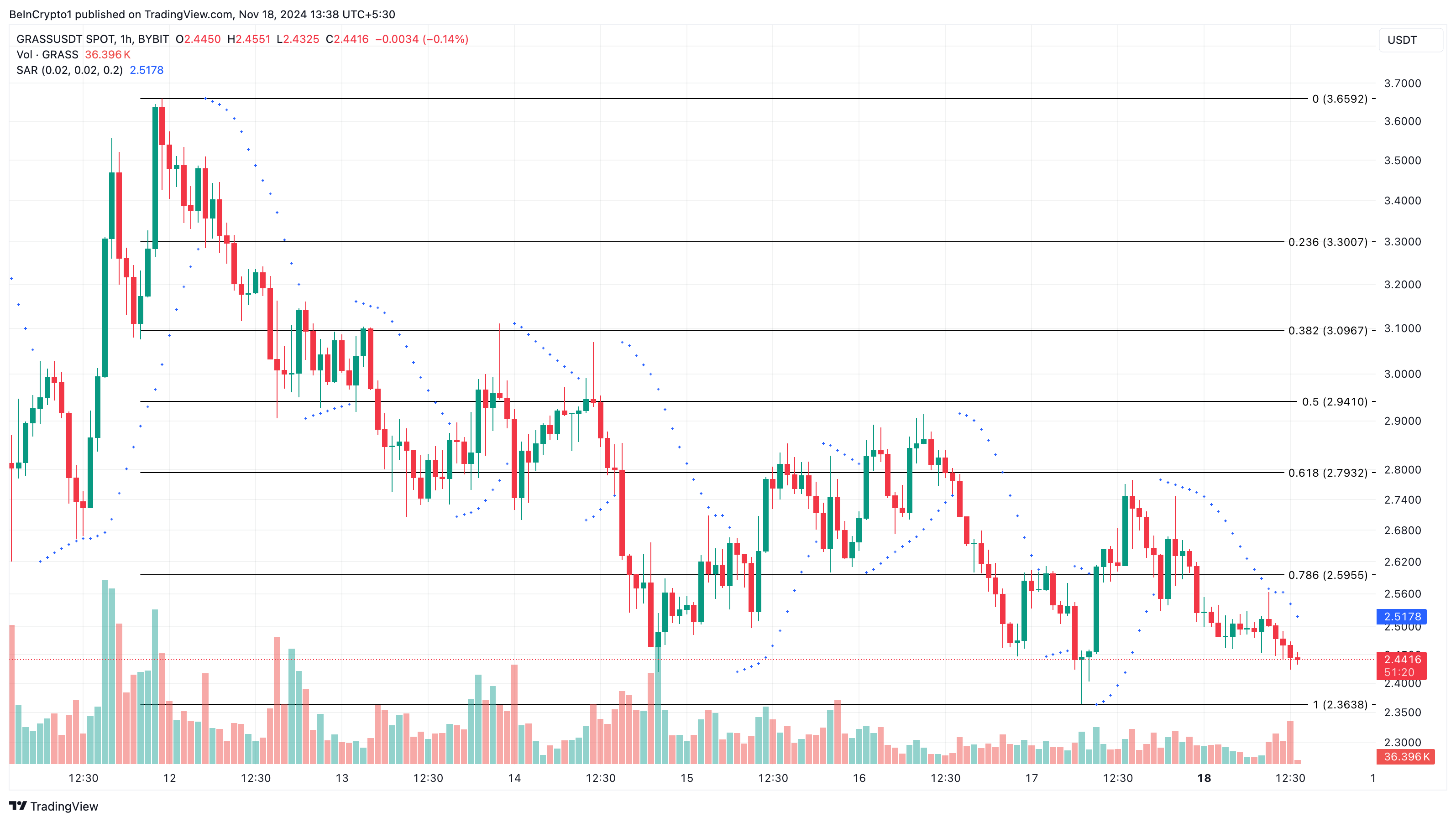 Isa sa mga dahilan kung bakit dapat abangan ang GRASS ay ang kapansin-pansin nitong market interest. Pero kabaligtaran ng RNDR, bumaba ang presyo ng GRASS ng 10.31% sa huling pitong araw. Sa one-hour chart, tumaas ang Parabolic Stop And Reverse (SAR) indicator sa itaas ng presyo.