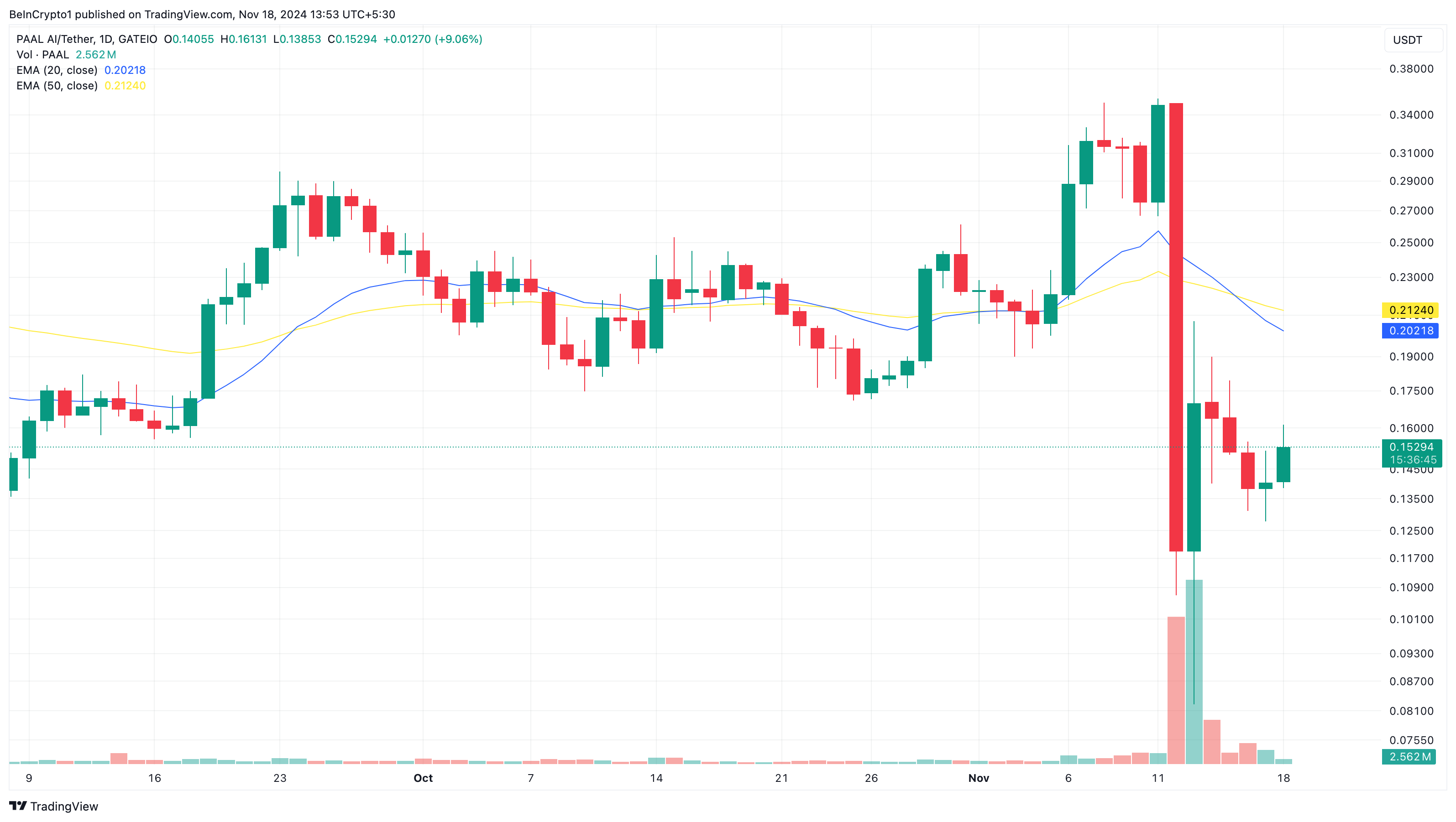 Ngayon, tumaas ng 12.35% ang presyo ng PAAL sa huling 24 oras dahil sa tumataas na demand. Ilang araw na ang nakalipas, biglang bumagsak ang halaga ng altcoin mula $0.35 hanggang $0.12 dahil sa tumaas na selling pressure.