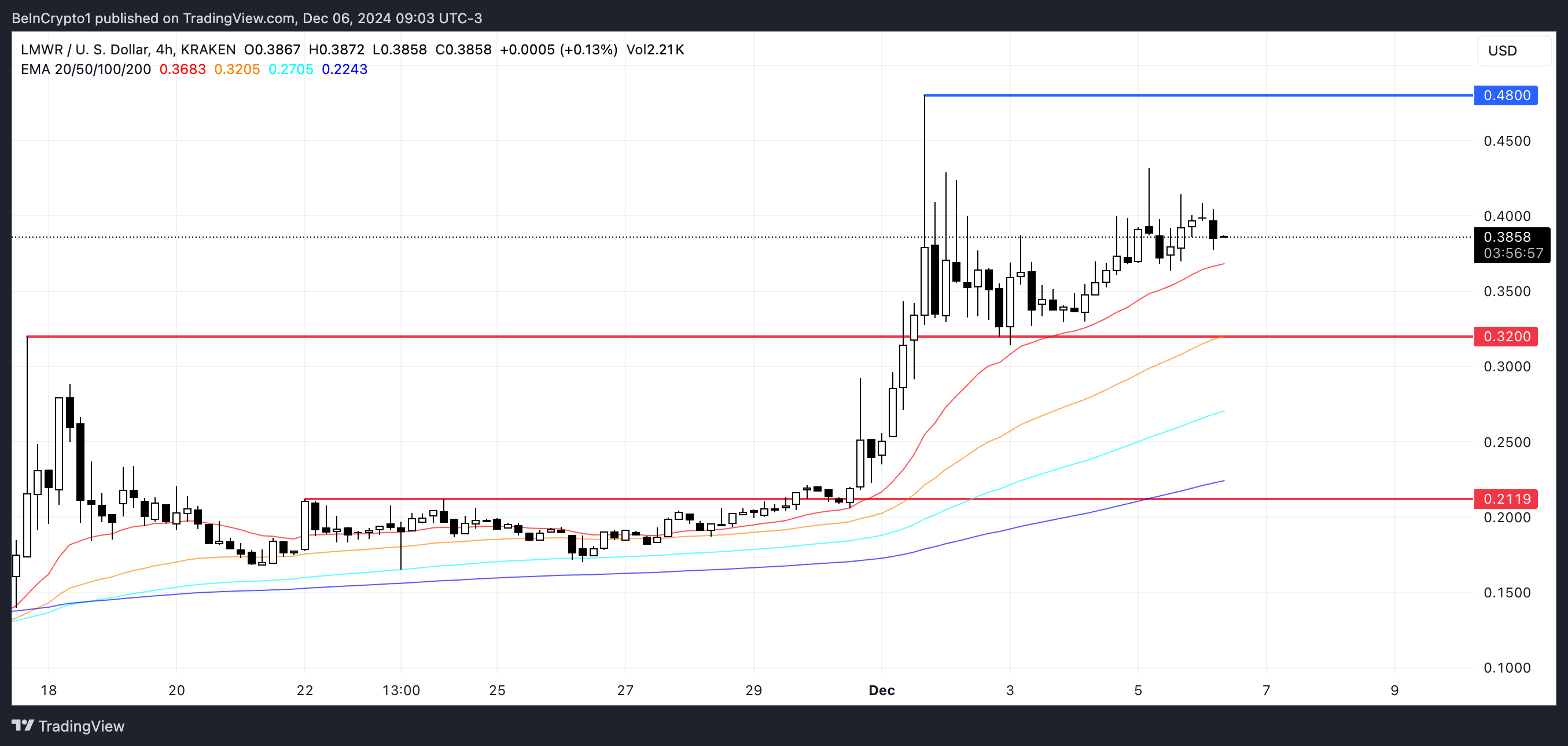 Ang price action ay nagpapakita ng posibleng resistance sa $0.48 kung magpapatuloy ang bullish momentum, pero kung bumaba, maaaring subukan ng LMWR ang support levels sa $0.32, at posibleng bumaba pa sa $0.21.