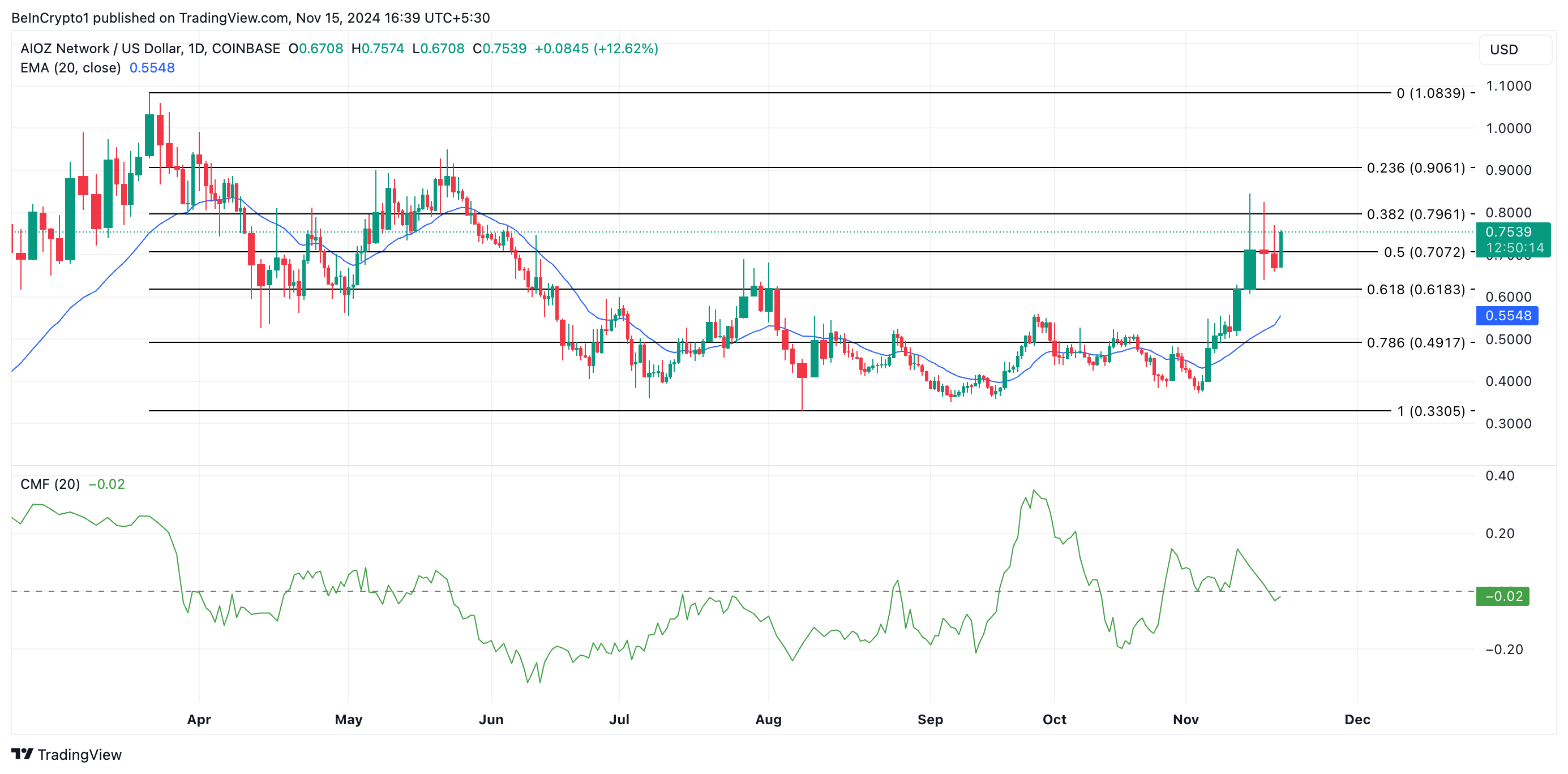 AIOZ, ang native token ng AIOZ Network—isang decentralized platform na gumagamit ng global network ng nodes para maghatid ng content—ay nakapagtala ng 45.63% na pagtaas sa presyo sa nakalipas na pitong araw. Isa ito sa mga AI tokens ng linggo na dapat bantayan. Sa ngayon, ito ay nagkakahalaga ng $0.75.