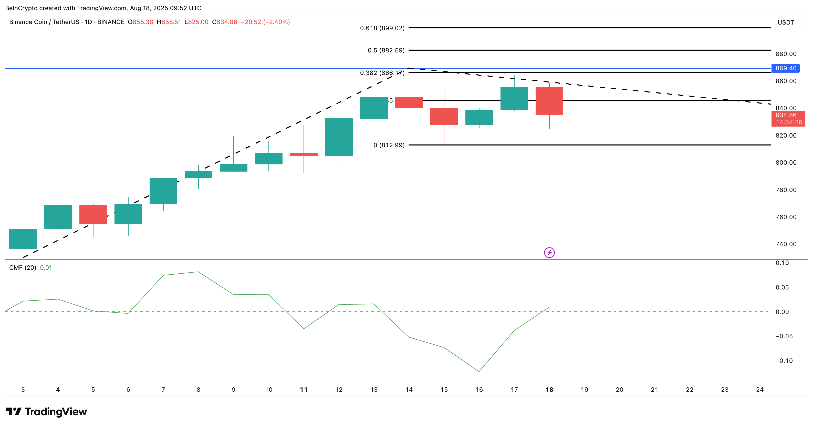 Sa kasalukuyan, ang Binance Coin (BNB) ay nagte-trade sa paligid ng $834, matapos bumaba ng 3.4% sa araw na ito. May medyo matibay na support sa chart na nasa ibabaw lang ng $812. Anumang pagbaba sa ilalim ng level na ito ay makakaapekto sa mga pangarap na maabot ang all-time high.