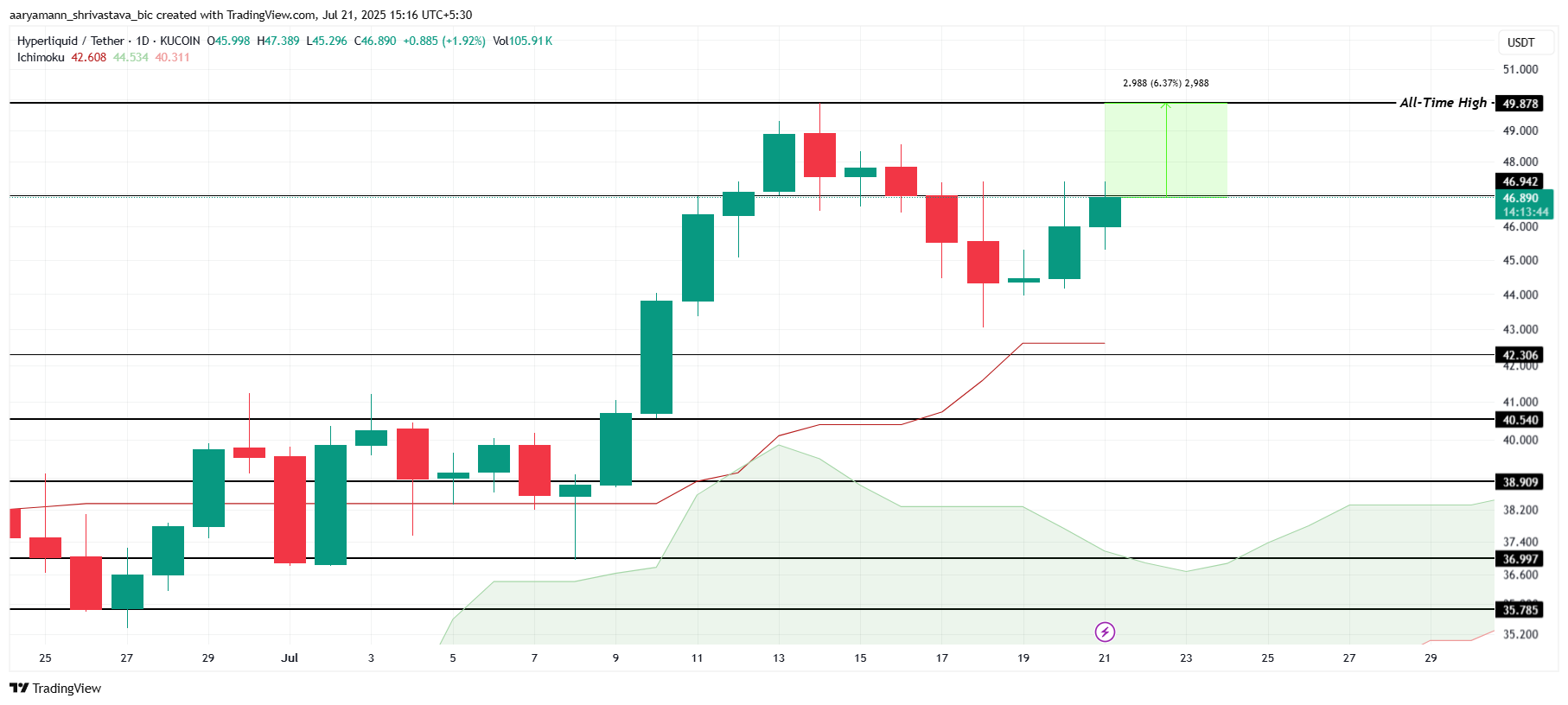 Kasalukuyang nasa $46.89 ang trading ng HYPE, at nasa mahigit 6% na lang ang layo mula sa all-time high nito na $49.87, na naitala noong nakaraang linggo. Ang Ichimoku Cloud na nabubuo sa ilalim ng candlesticks ay nagpapakita ng lumalakas na bullish strength. Ang technical setup na ito ay nagpapahiwatig ng mataas na posibilidad na malampasan ng HYPE ang $50.00 mark sa lalong madaling panahon.