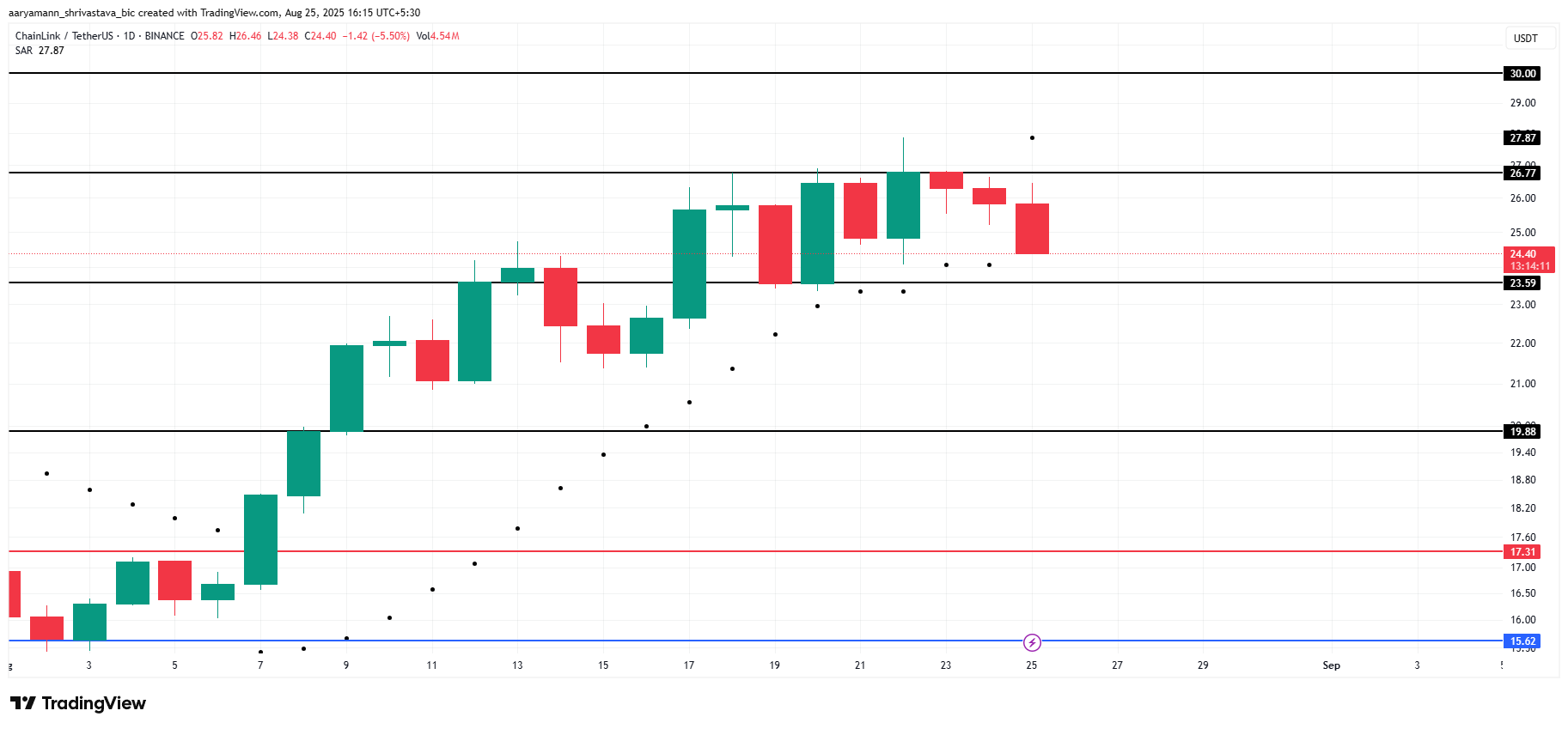 Ang LINK ay kasalukuyang nasa presyo na $24.4 at nakakaranas ng downtrend. Ang Parabolic SAR indicator na nasa ibabaw ng candlesticks ay nagkukumpirma ng bearish sentiment, na nagpapahiwatig ng posibleng patuloy na pagbaba. Pero, pwedeng magbago ang market kung may positive catalysts o magbago ang investor sentiment sa malapit na hinaharap, na posibleng magdulot ng reversal sa trend.