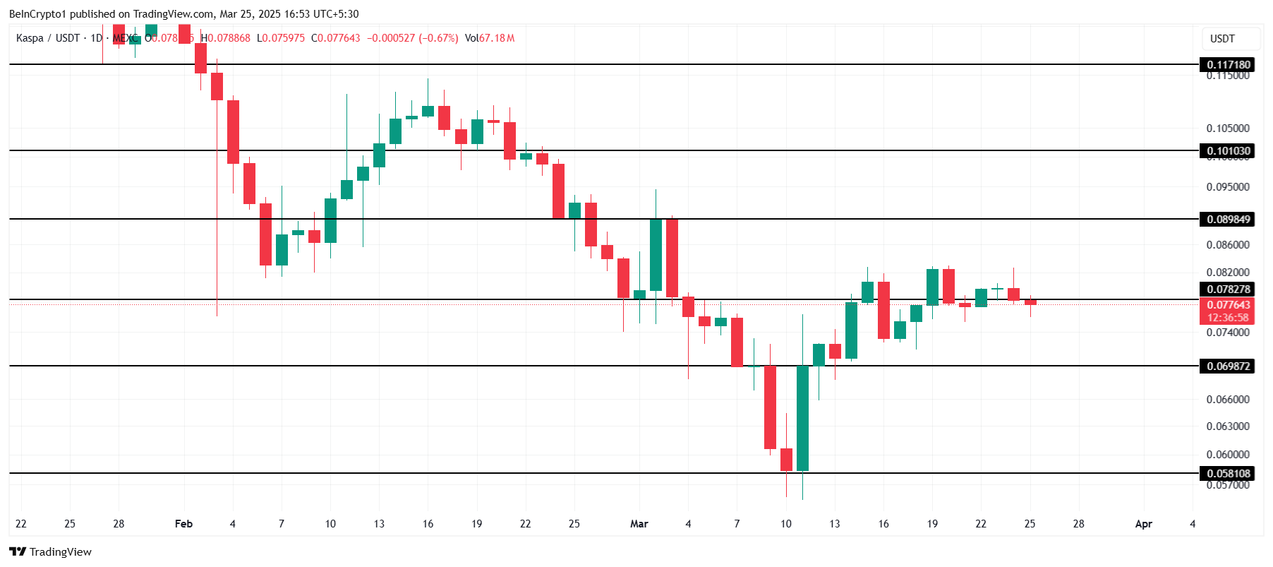Isa pang altcoin na dapat bantayan ngayong Marso, Kaspa (KAS), ay kasalukuyang nagte-trade sa $0.077, nasa ilalim lang ng critical resistance na $0.078. Ang pag-secure sa level na ito bilang support ay magbubukas ng pinto para sa karagdagang pagtaas, na posibleng itulak ang presyo sa $0.089. Ang ganitong galaw ay magpapahintulot sa KAS na mabawi ang mga pagkalugi sa buong Marso, na maghahanda para sa paglago.
