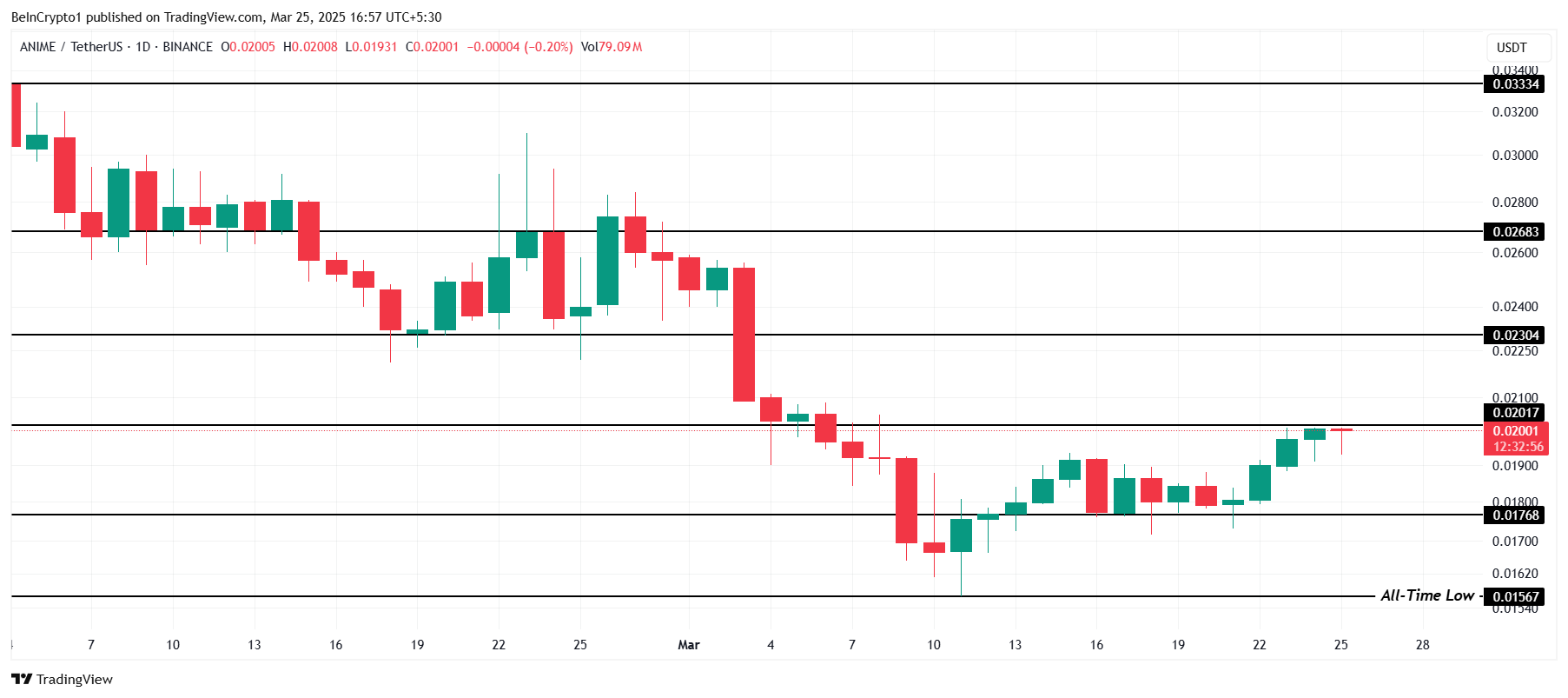 Ang Animecoin (ANIME) ay sumusubok na lampasan ang critical na $0.0201 level at gawing support ito. Mahalaga ang galaw na ito para mabawi ang mga pagkalugi mula huling bahagi ng Pebrero at unang bahagi ng Marso. Kung magtagumpay, maaring tumaas ang ANIME sa $0.0268, na magmamarka ng makabuluhang recovery at potensyal na paglago sa mga darating na linggo.