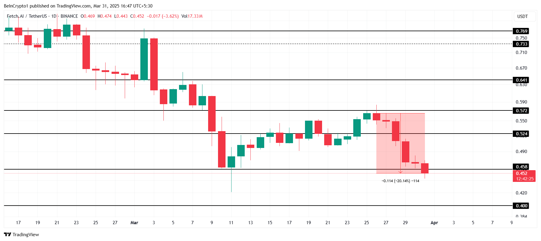 Ang presyo ng FET ay bumaba ng 20% sa nakaraang limang araw, bumagsak sa $0.452 matapos mawala ang support sa $0.458. Ang pagbaba na ito ay naglalagay ng altcoin sa ilalim ng pressure. Gayunpaman, bukas pa rin ang pinto para sa posibleng pag-recover dahil sa mga paparating na developments sa loob ng network.