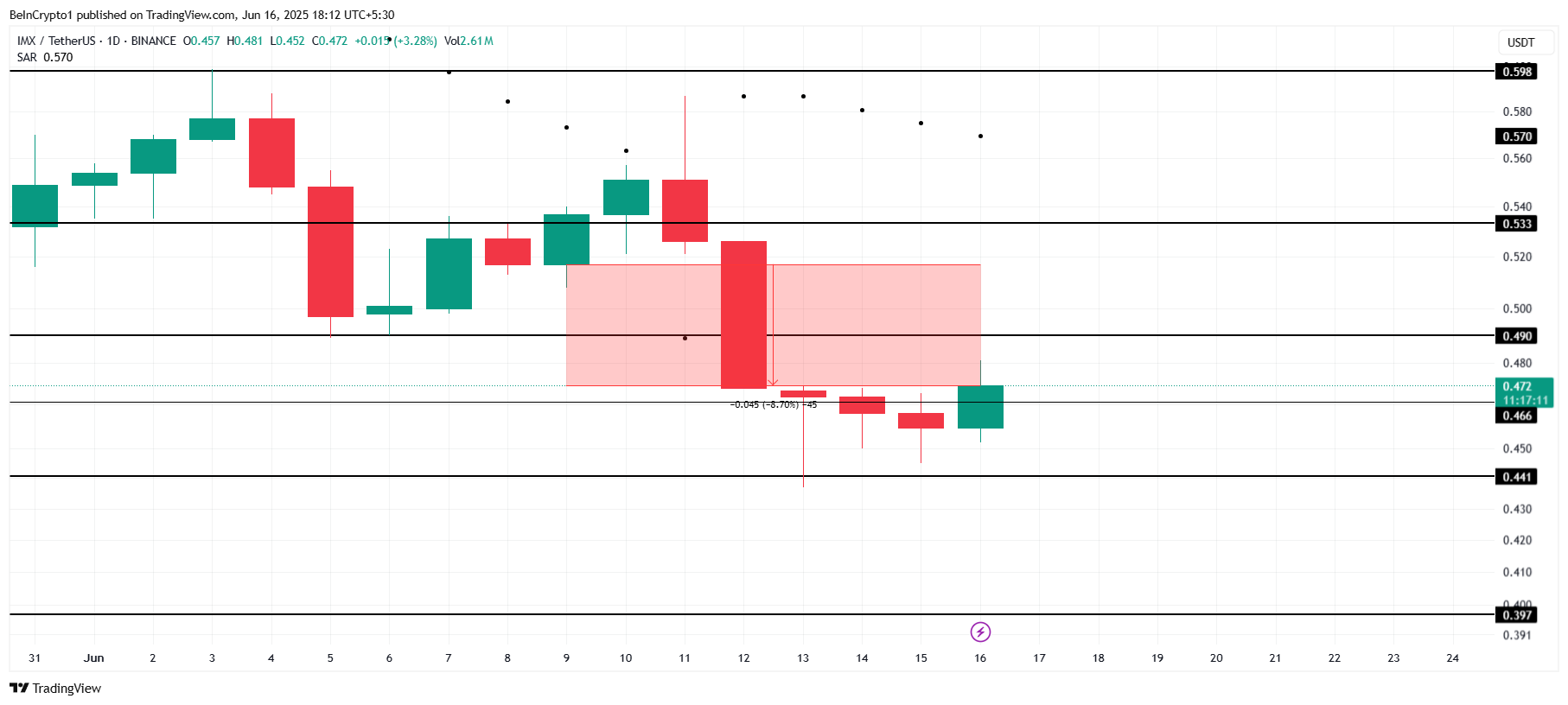 Nakaranas ng 8.7% na pagbaba ang IMX nitong nakaraang linggo, at kasalukuyang nasa $0.47 ang presyo nito. Ang altcoin ay nahihirapang mag-hold ng support sa $0.46. Pero, kung magtagumpay itong ma-secure ang level na ito, pwedeng i-target ng IMX ang susunod na resistance sa $0.49, na may potential na umabot hanggang $0.53.
