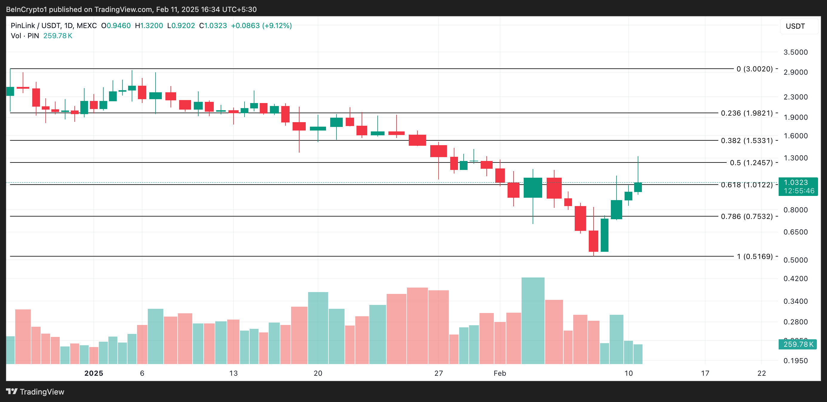 AI token PIN ay isang trending altcoin ngayon. Ang presyo nito ay tumaas ng 10% sa nakalipas na 24 oras, na pinapagana ng pangkalahatang pagtaas ng market. Gayunpaman, ang rally na ito ay hindi suportado ng anumang makabuluhang demand para sa altcoin, na makikita sa bumababang daily trading volume nito.