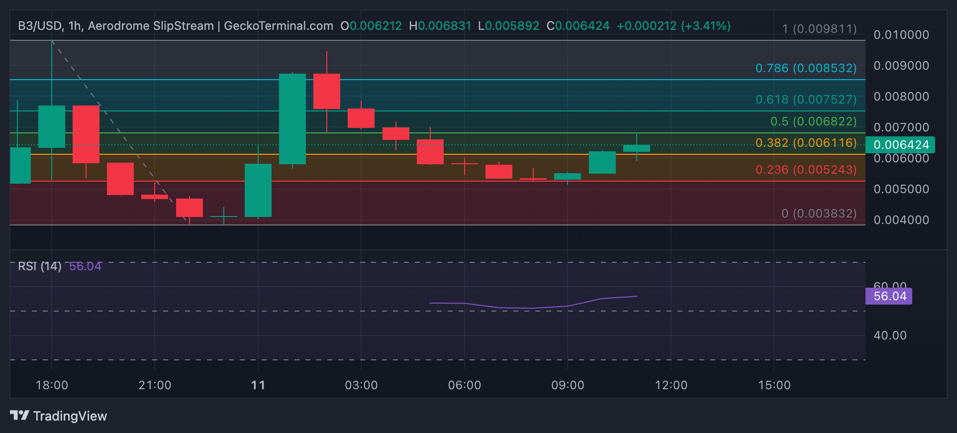 Ang bagong nag-launch na Layer-3 coin na B3 ay isa pang altcoin na nakatanggap ng makabuluhang atensyon ngayon mula sa mga trader at analyst. Sa kasalukuyan, ang altcoin ay nagte-trade sa $0.0063, tumaas ng 34% sa nakalipas na 24 oras.