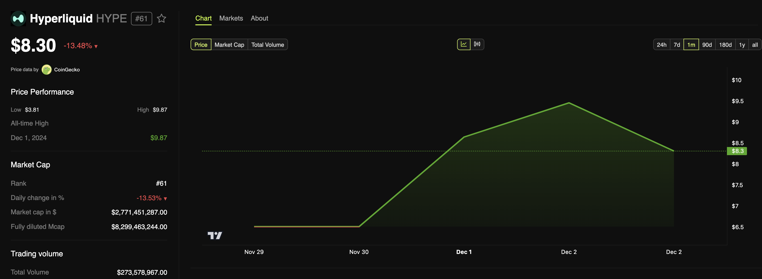 Sa kasalukuyan, ang presyo ng HYPE ay nasa $8.52, na may 11.82% pagbaba sa nakaraang 24 oras. Pero hindi pa ito nakalista sa anumang major exchange, na nagpapahiwatig na nasa price discovery mode pa ito.