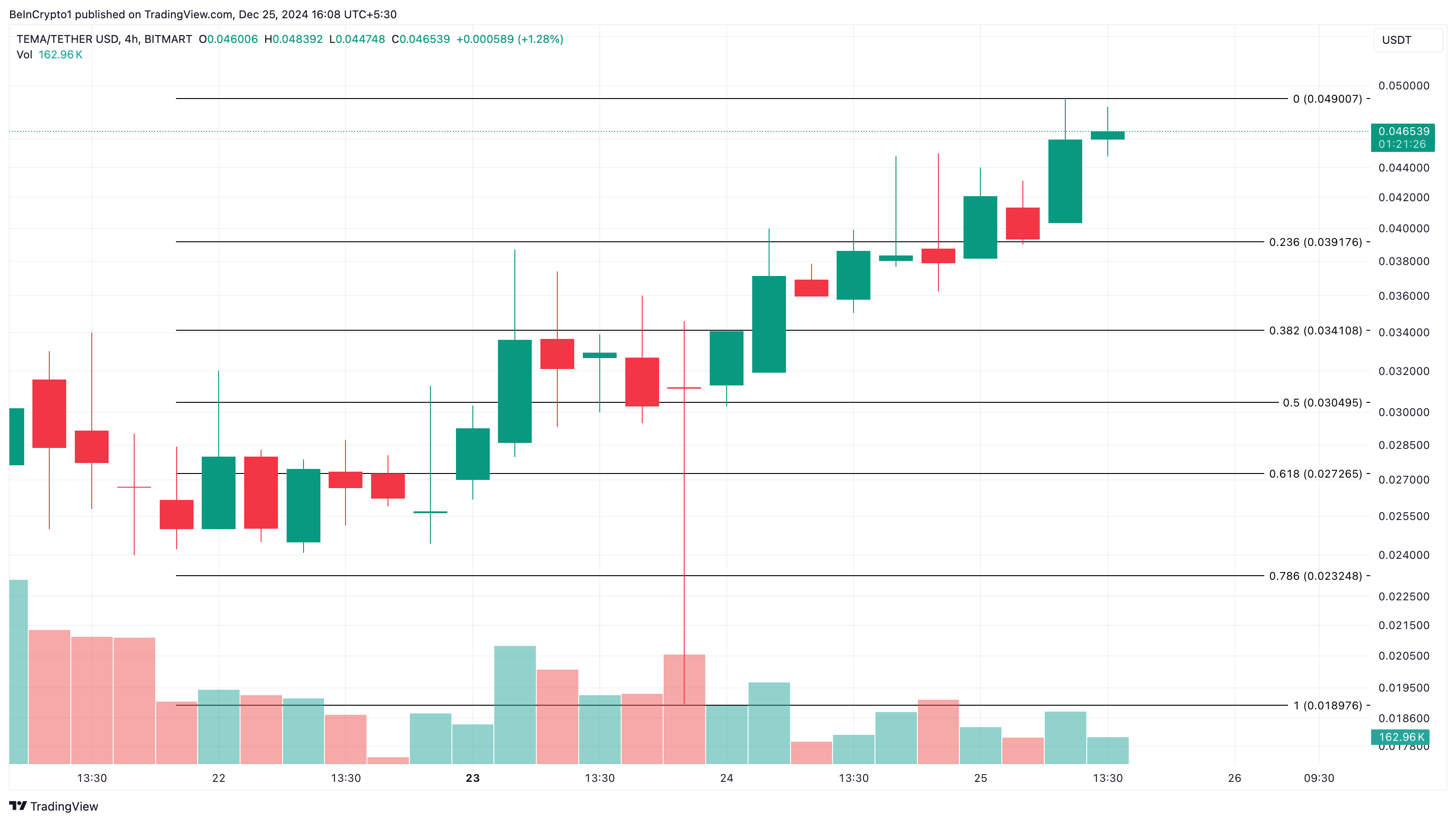 Ang pagtaas ng presyo ay nagdala ng value nito sa $0.04. Sa 4-hour chart, tumaas ang presyo ng TEMA dahil sa pagtaas ng buying pressure sa token. Makikita rin sa imahe sa ibaba ang magandang level ng volume sa paligid nito.