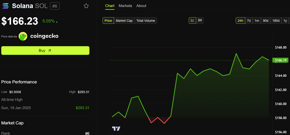Sa ngayon, ang Solana ay nagte-trade sa $166.23, tumaas ng mahigit 5% sa nakaraang 24 oras.