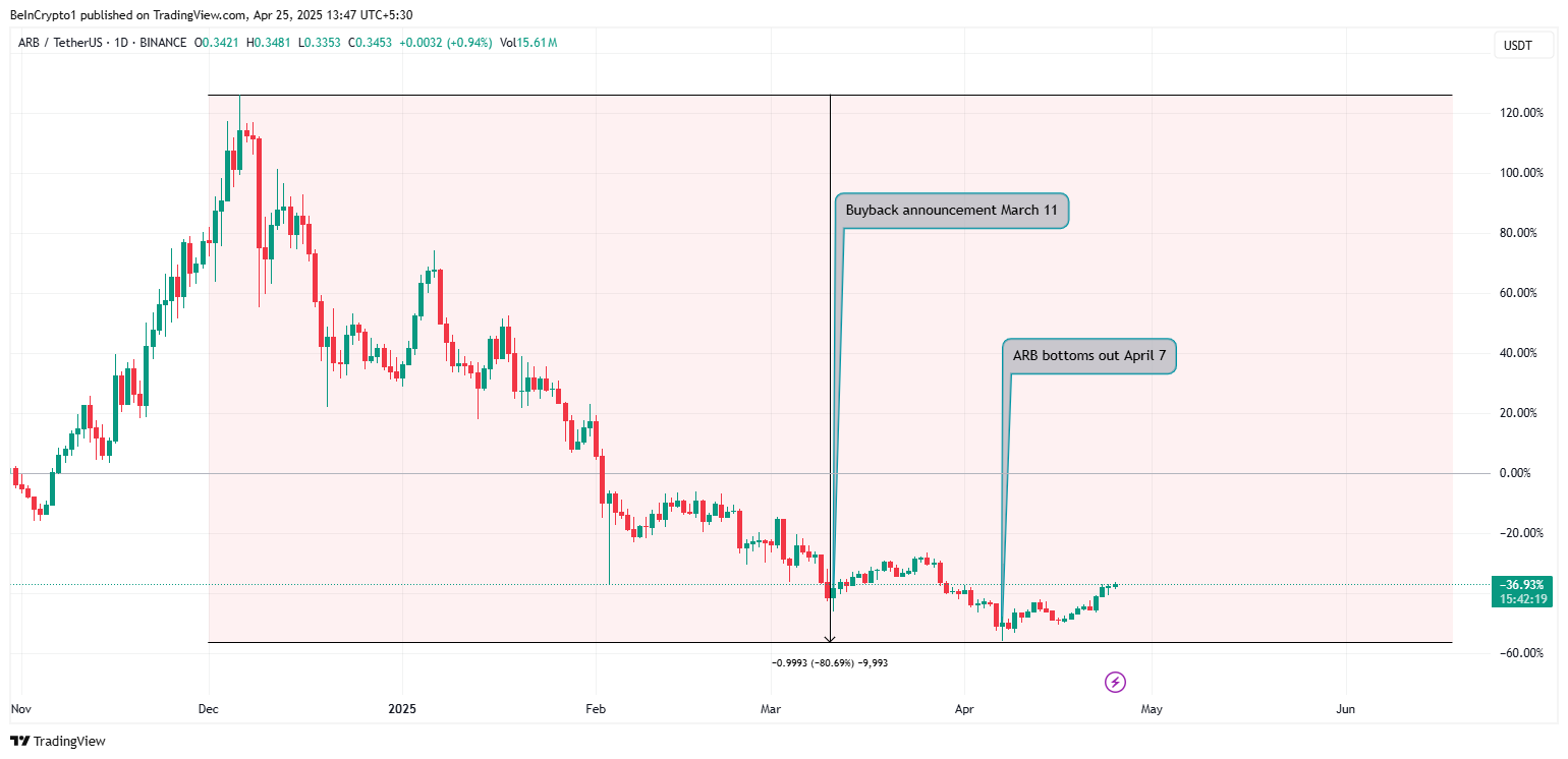 Kabilang dito ang token buyback initiative noong March para palakasin ang ecosystem at i-absorb ang supply shocks dahil sa malaking token unlock event. Sa simula, epektibo ito, tumaas ng 36% ang presyo ng ARB bago bumagsak ulit sa $0.2420 noong April 7.