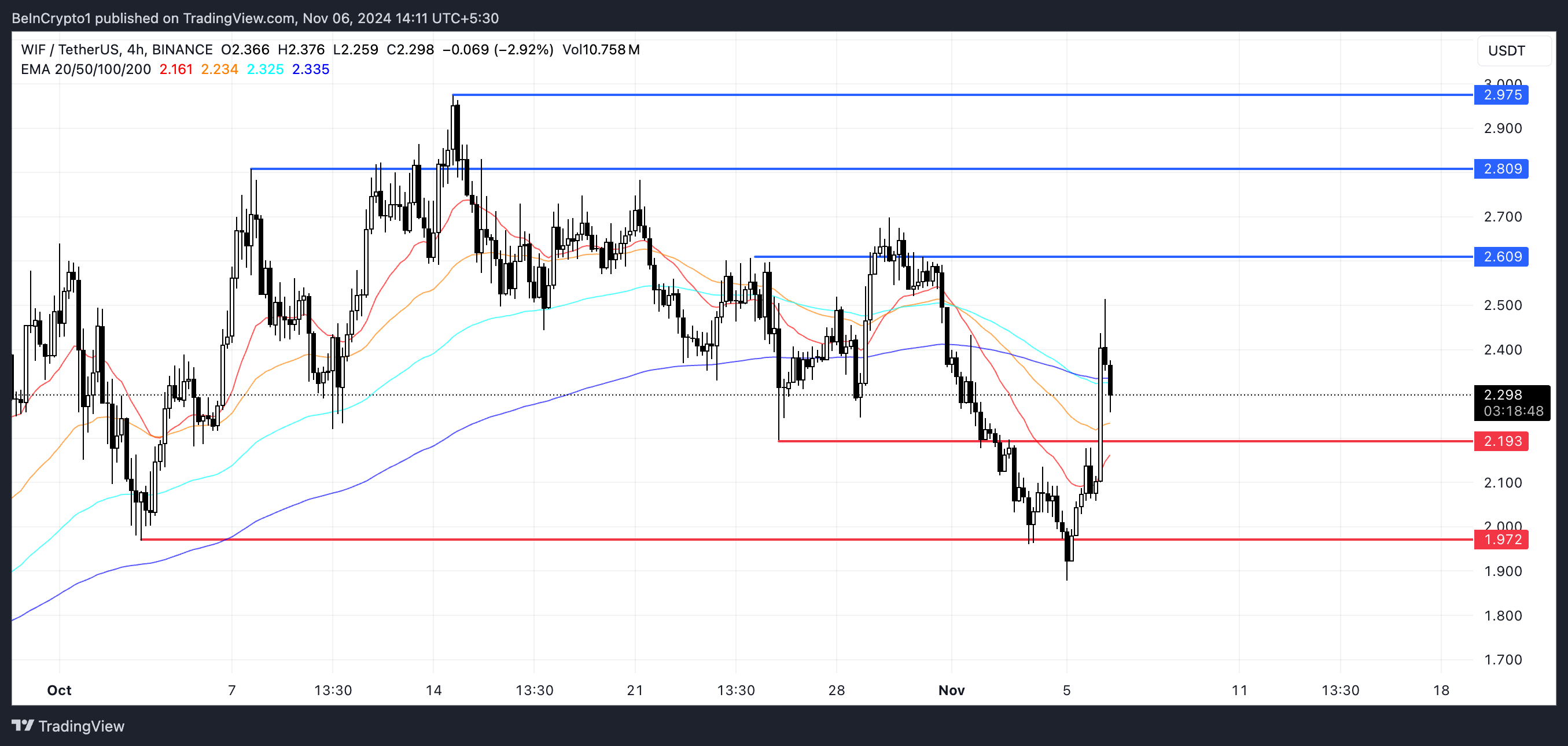 Kung maganap ang bullish crossover na ito, maaaring layunin ng presyo ng WIF na tumagos sa mga antas ng resistensya sa paligid ng $2.6, $2.8, at $2.97, na nagmamarka ng potensyal na 30% na paglago ng presyo.