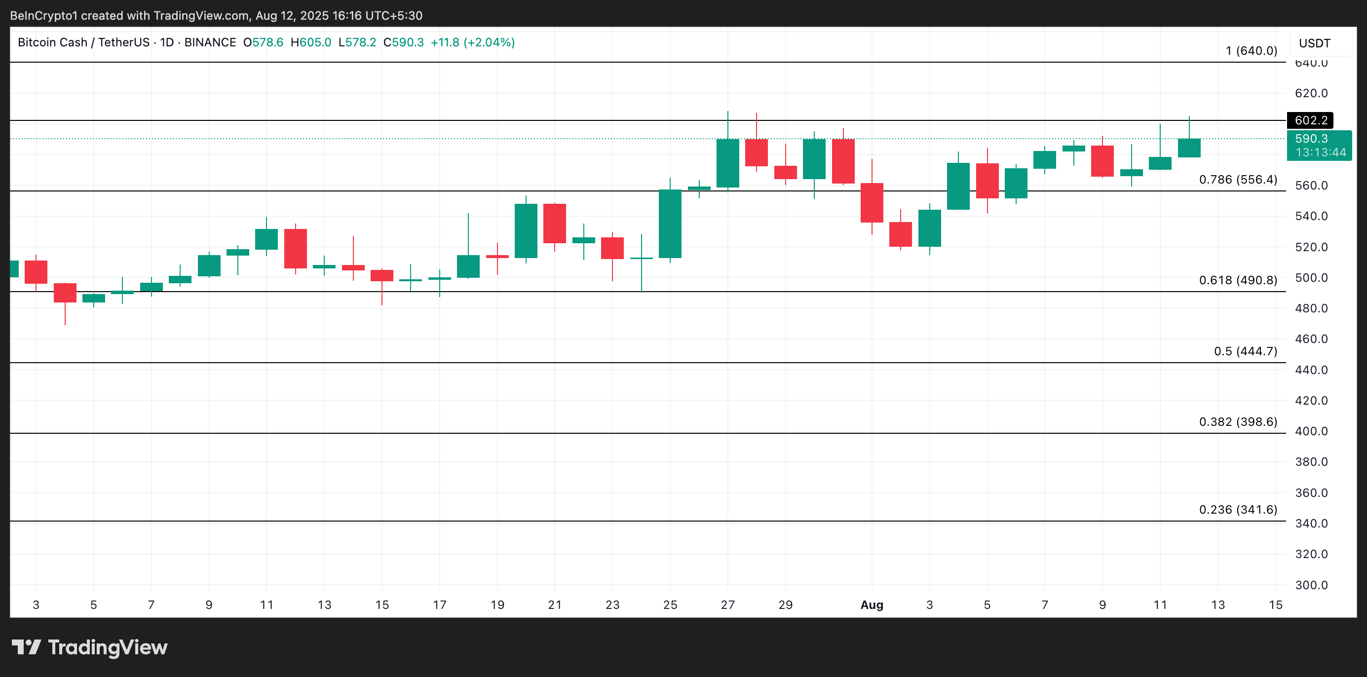 Ang paggalaw na ito ay nagpapatuloy sa rally ng BCH na nagsimula noong August 3. Sa kasalukuyan, nagte-trade ito sa $590.30, at mula noon ay tumaas na ng 14% ang presyo ng altcoin at mukhang patuloy pa itong tataas.