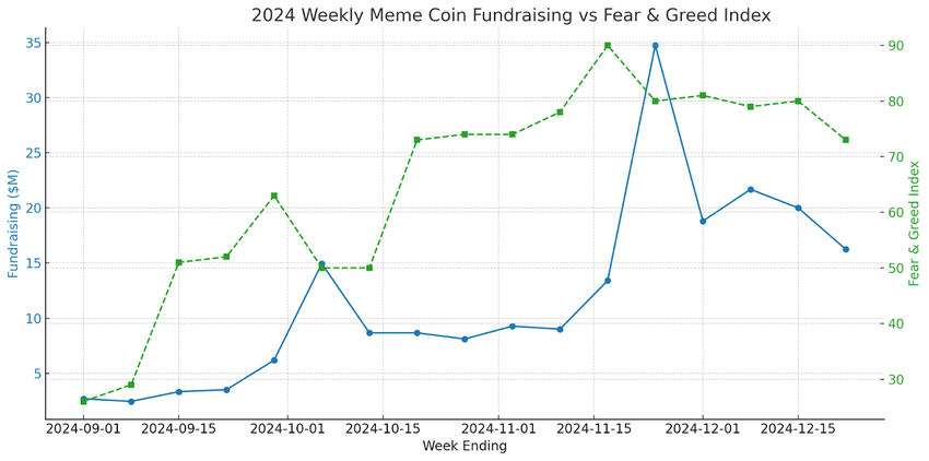 Lingguhang Pangangalap ng Pondo ng Meme Coin kumpara sa Sentimyento ng Market (Setyembre-Disyembre 2024)