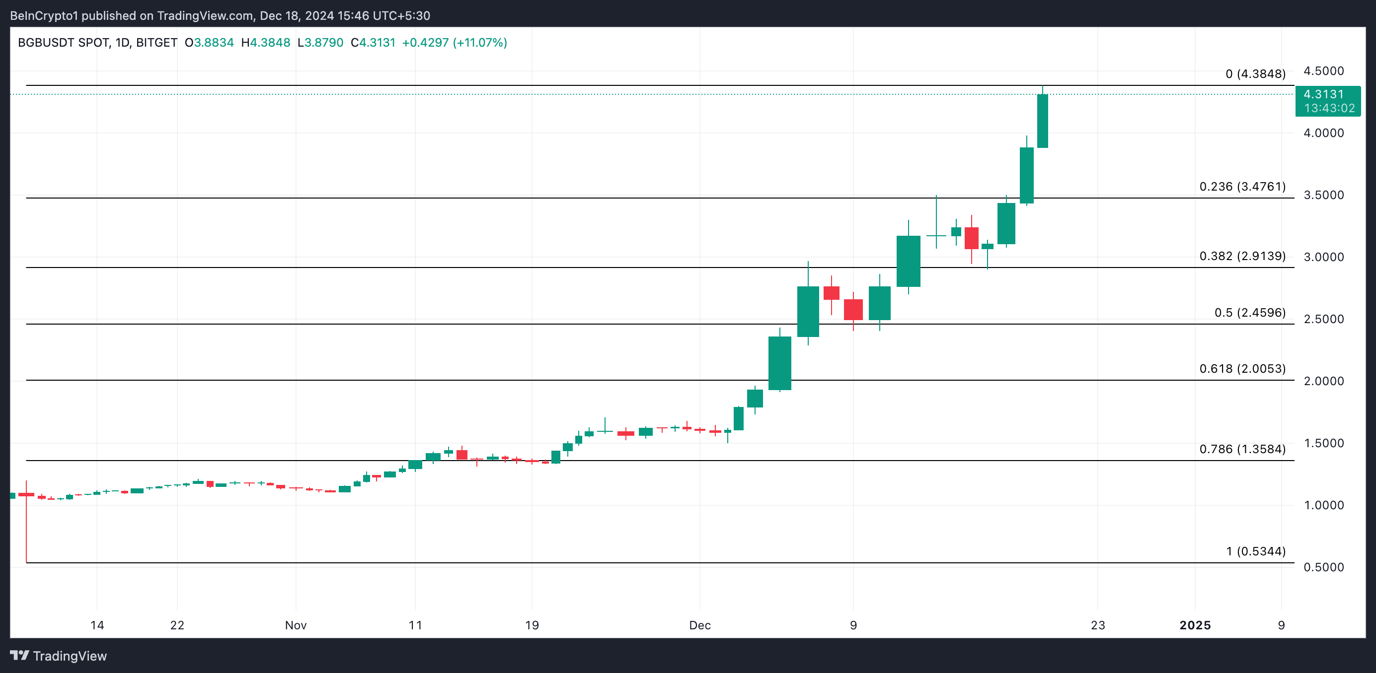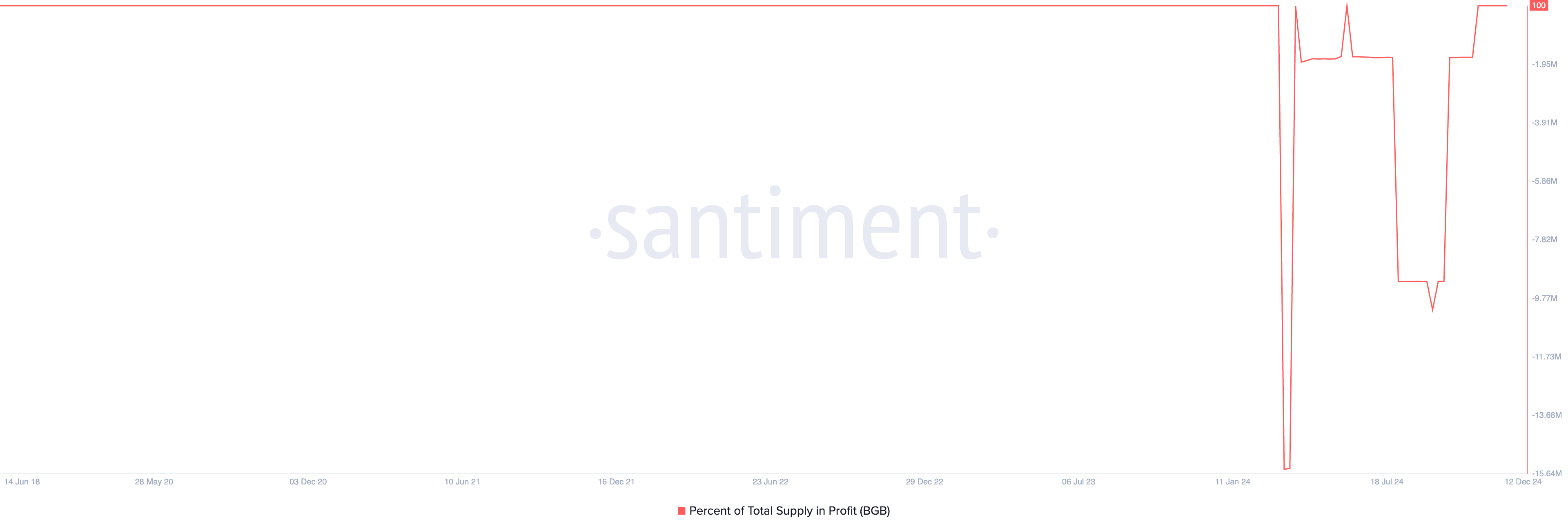 Ang presyo ng BGB ay tumaas ng 19% sa nakaraang 24 oras, naitulak ito lampas sa $4 psychological mark. Sa maagang Asian session ng Miyerkules, ang altcoin ay nagpalitan ng kamay sa bagong all-time high na $4.38 bago nagkaroon ng bahagyang pagbaba. Ayon sa data ng Santiment, dahil sa double-digit na pagtaas ng halaga ng BGB, 100% ng circulating supply nito ay nasa profit na.