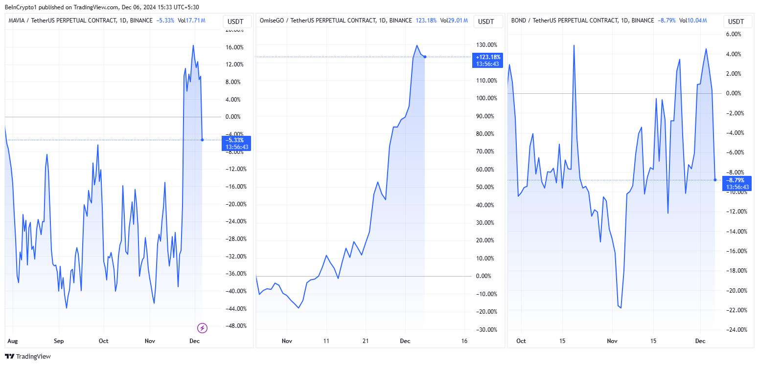 Pagkatapos ng anunsyo, bumaba ang halaga ng MAVIA, OMG, at BOND. Inaasahan ito dahil ang token delistings mula sa kilalang exchanges ay kadalasang nagdudulot ng malaking sell-offs. Wala sa mga tokens na ito ang available para sa spot trading sa Binance.