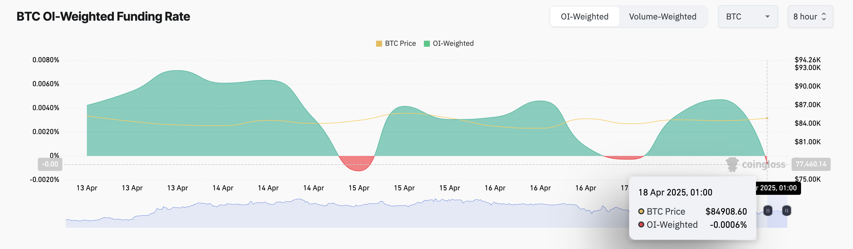 Ngayon, ang funding rate ng BTC ay naging negative, na nagpapahiwatig ng mataas na demand para sa short positions sa mga futures market participants nito. Sa kasalukuyan, ito ay nasa -0.0006%.