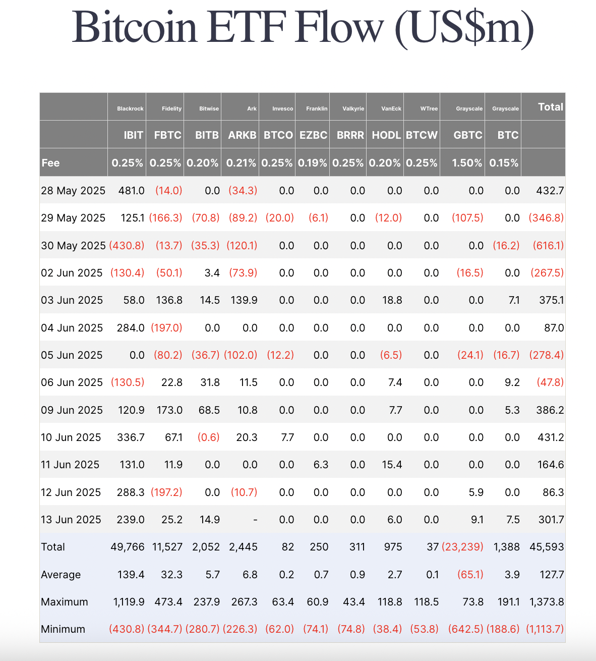 Mula Hunyo 9 hanggang 13, nag-record ang mga Bitcoin-backed funds ng $1.37 bilyon na net inflows, na nagmarka ng unang positibong lingguhang inflow matapos ang dalawang sunod na linggo ng outflows. Ang pagpasok ng kapital ay naitala kahit na medyo hindi maganda ang galaw ng presyo ng BTC sa karamihan ng linggo, na unang nag-udyok sa mga institutional investors na bawasan ang kanilang exposure.