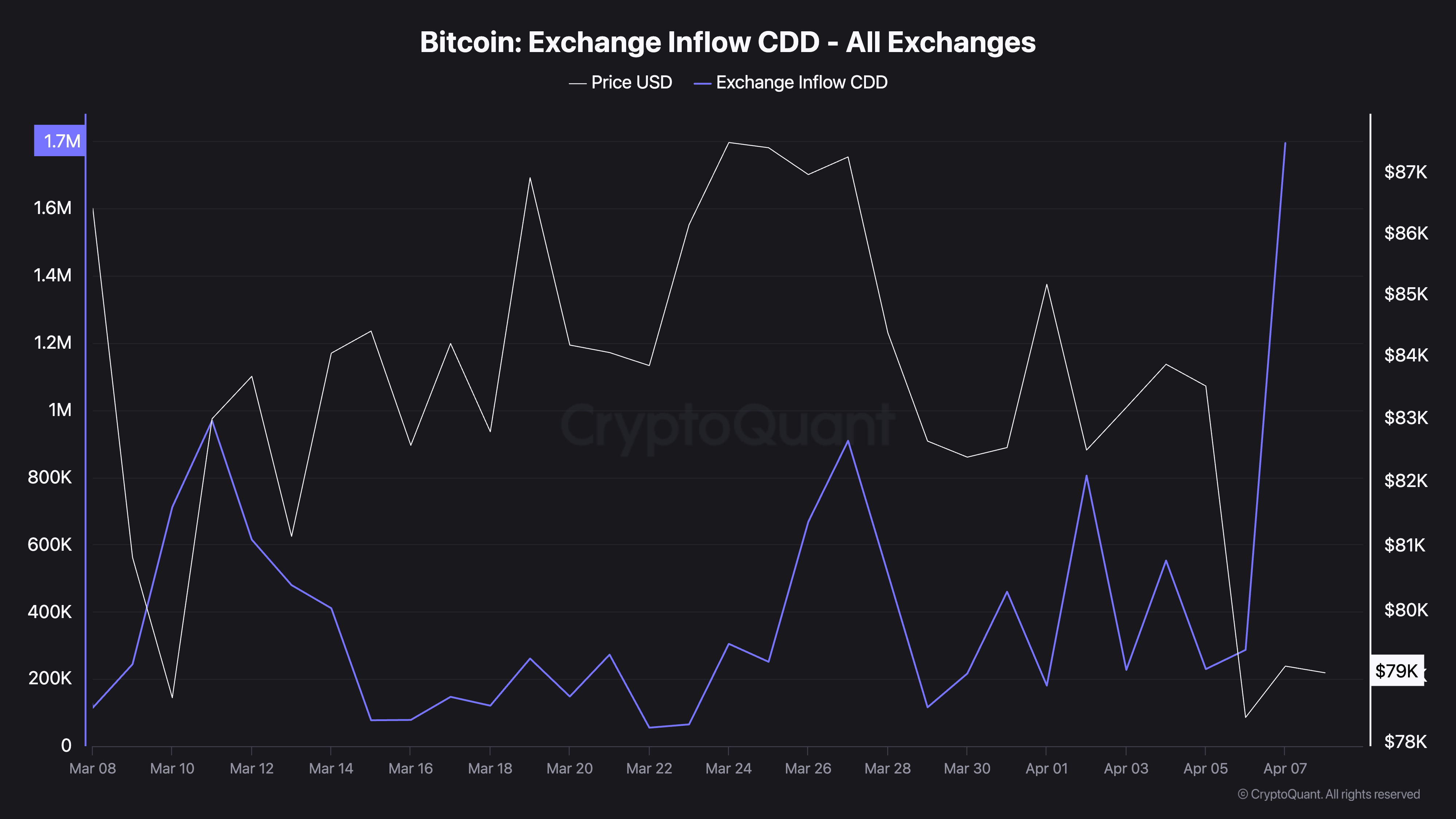 Ang Coin Days Destroyed (CDD) ng Bitcoin na dine-deposit sa exchanges ay umabot sa pinakamataas na punto sa loob ng 30 araw.