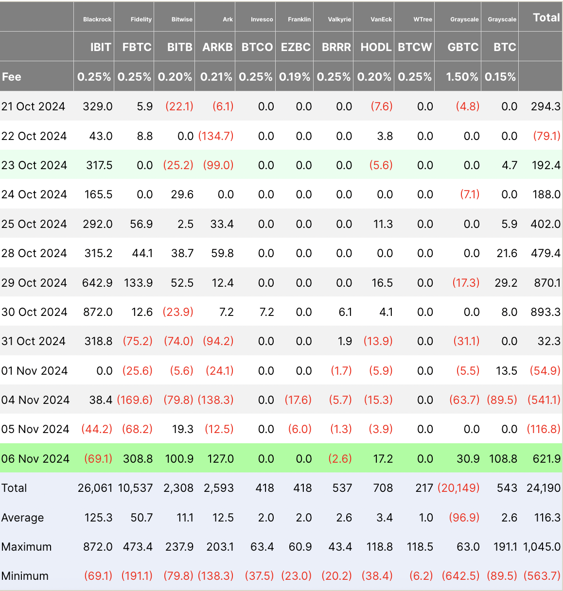 Kahit na may previous outflows, nakapag-manage ang Grayscale’s GBTC ng modest change na $30.9 million. Ang inflows ng araw na ito ay nag-highlight ng general uptick sa interest across various ETFs, na kabaligtaran ng recent periods ng volatility at outflows sa ibang funds. Umabot sa $621.9 million ang total inflows, na nagpapakita ng demand for Bitcoin products.