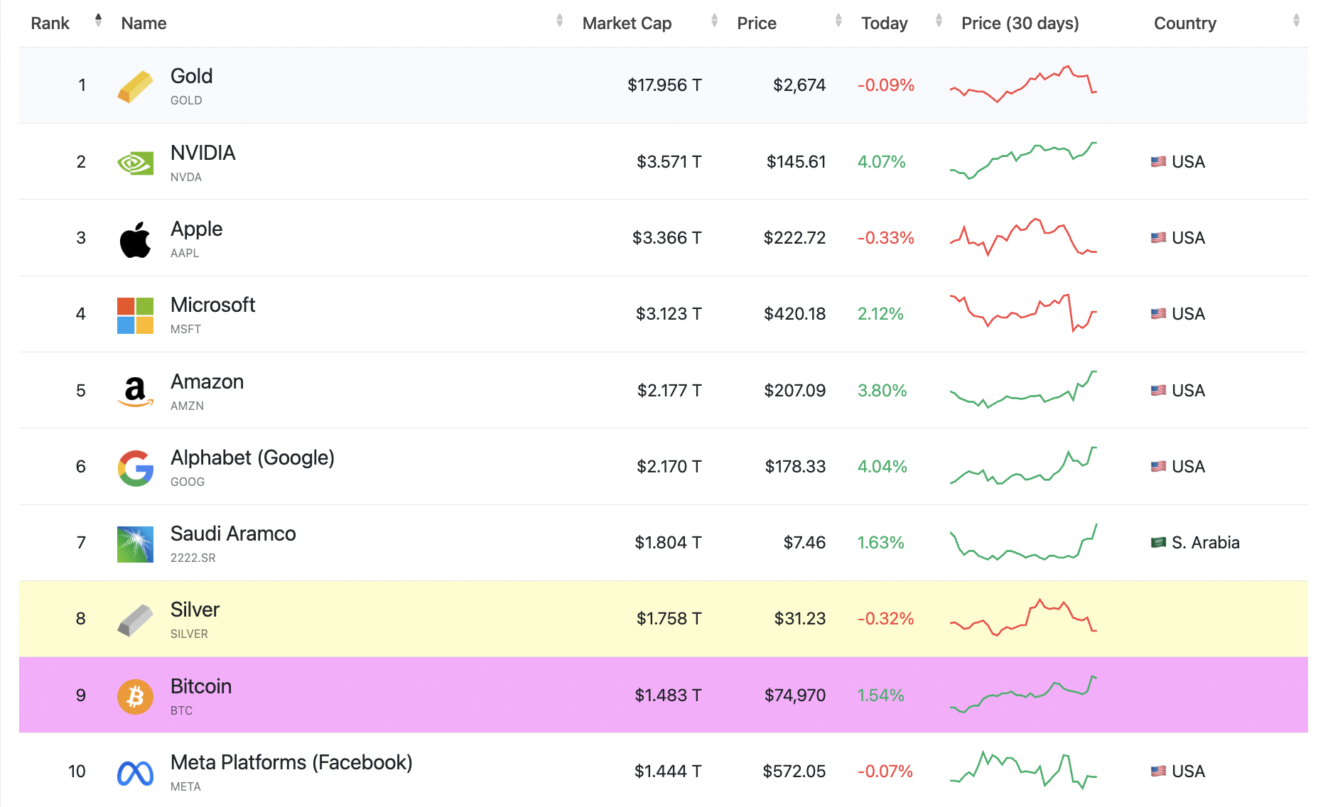 Noong March 2024, saglit na nalampasan ng Bitcoin ang silver nang maging ang ika-8-ranking global asset ang Bitcoin.