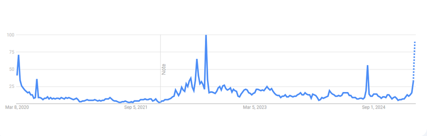 Samantala, ang mga galaw ng presyo ng Bitcoin ay madalas na malapit na nauugnay sa macroeconomic uncertainty. Ang data mula sa Google Trends ay nagpapakita na ang mga paghahanap para sa “US recession” ay umabot sa pinakamataas na antas mula noong Agosto 2024—historically isang signal ng paparating na market volatility. Ang mga katulad na pagtaas sa mga paghahanap noong kalagitnaan ng 2022 at huli ng 2024 ay kasabay ng matinding pagbaba ng presyo ng Bitcoin.