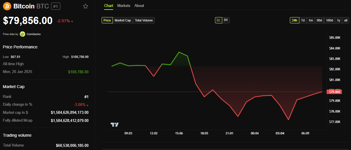 Sa agarang epekto, bumagsak ang presyo ng Bitcoin sa ibaba ng psychological level na $80,000. Sa kasalukuyan, ang BTC ay nagte-trade sa $79,856, bumaba ng halos 3% mula nang magbukas ang sesyon noong Martes.