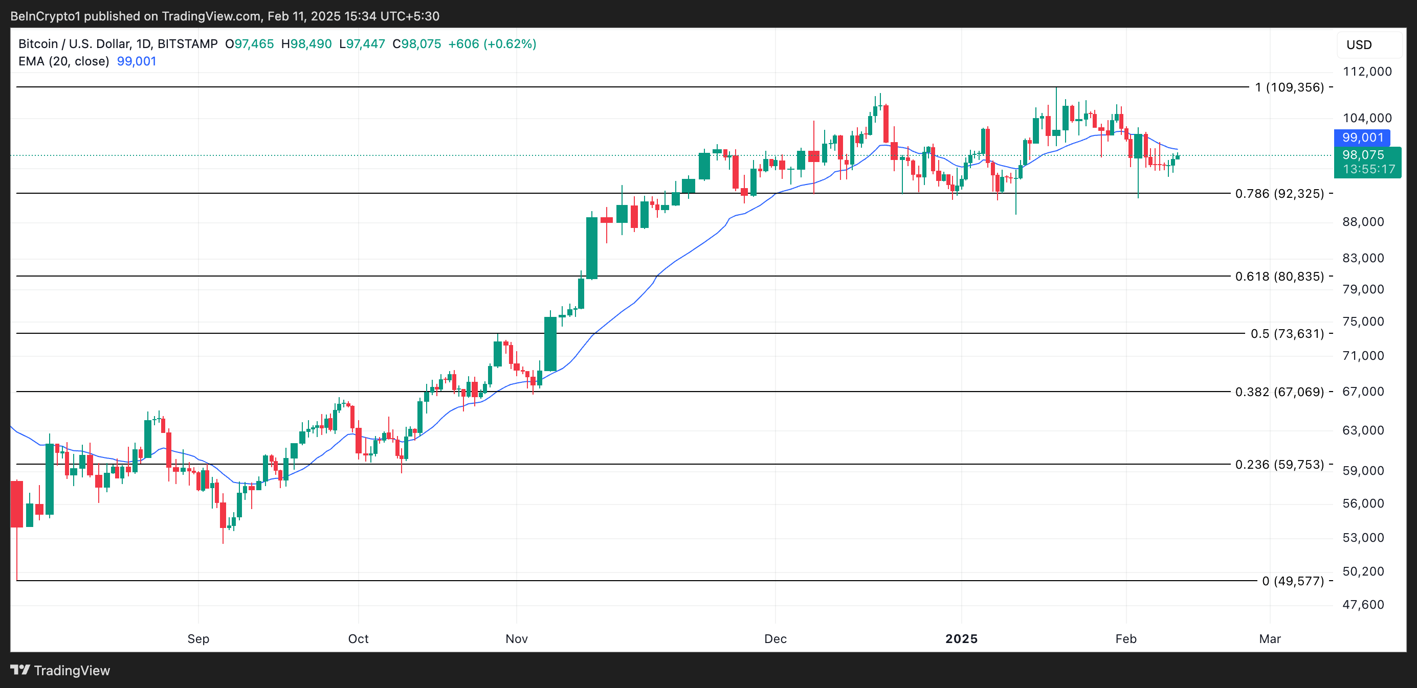 Meron ding pagtatangka ang BTC na lumampas sa kanyang 20-day exponential moving average (EMA) na nagkukumpirma ng muling pagtaas ng demand para sa king coin. Sa kasalukuyan, ang BTC ay nagte-trade sa $98,022, bahagyang mas mababa sa key moving average na ito, na bumubuo ng resistance sa itaas nito sa $98,995.