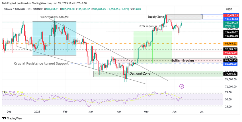 Pero, naantala ang rally dahil sa profit booking, na nag-establish ng supply zone sa pagitan ng $109,242 at $111,774. Para sa mga trader na gustong mag-long position sa Bitcoin, dapat hintayin muna ang candlestick close sa ibabaw ng midline (mean threshold) ng supply zone sa $110,478.