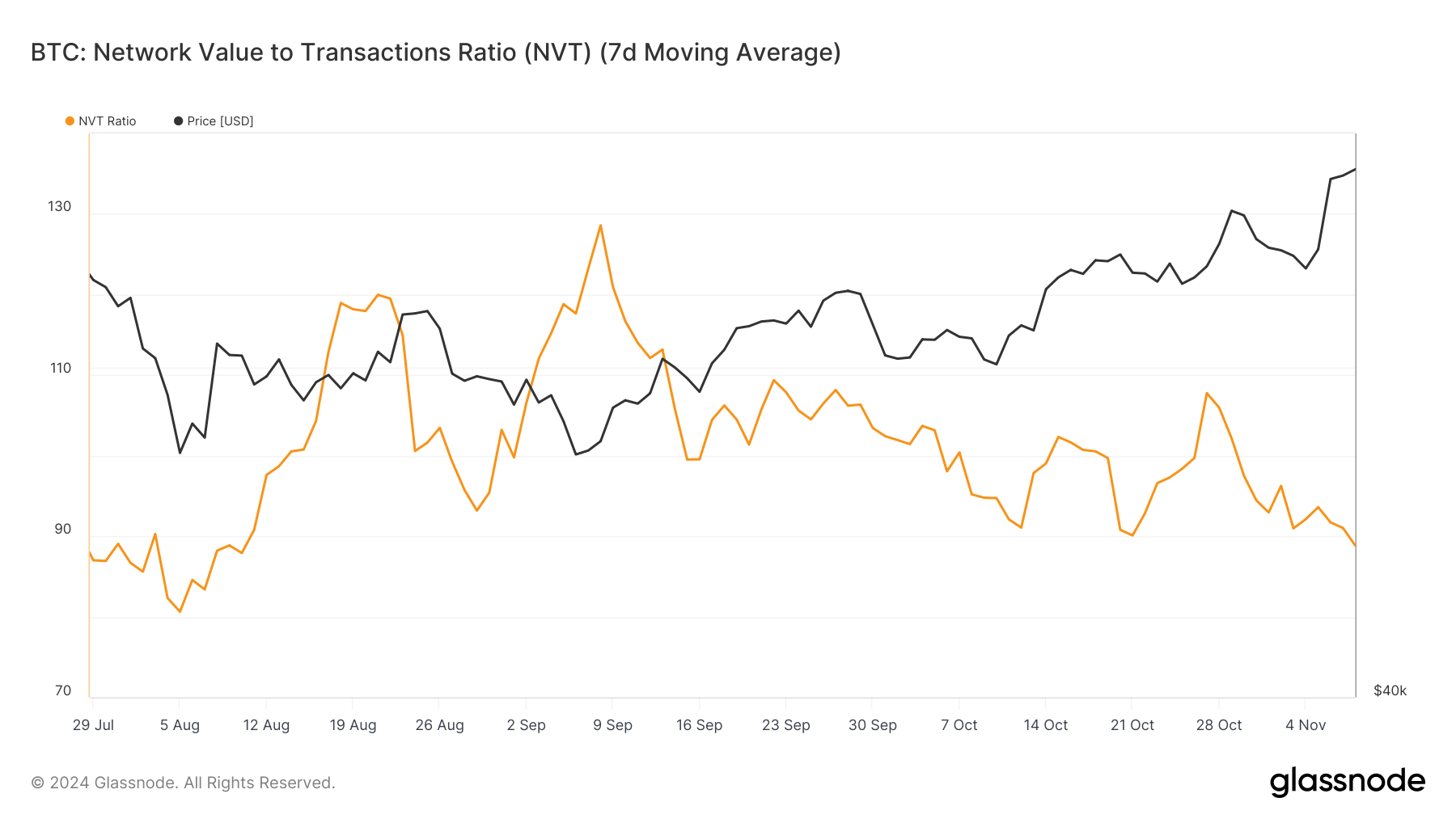 Malakas ang macro momentum para sa Bitcoin, sinusuportahan ng NVT (Network Value to Transactions) Ratio, na nasa three-month low ngayon. Kapag mababa ang NVT Ratio, ibig sabihin hindi overvalued ang Bitcoin, kaya mas mababa ang chance ng immediate correction.