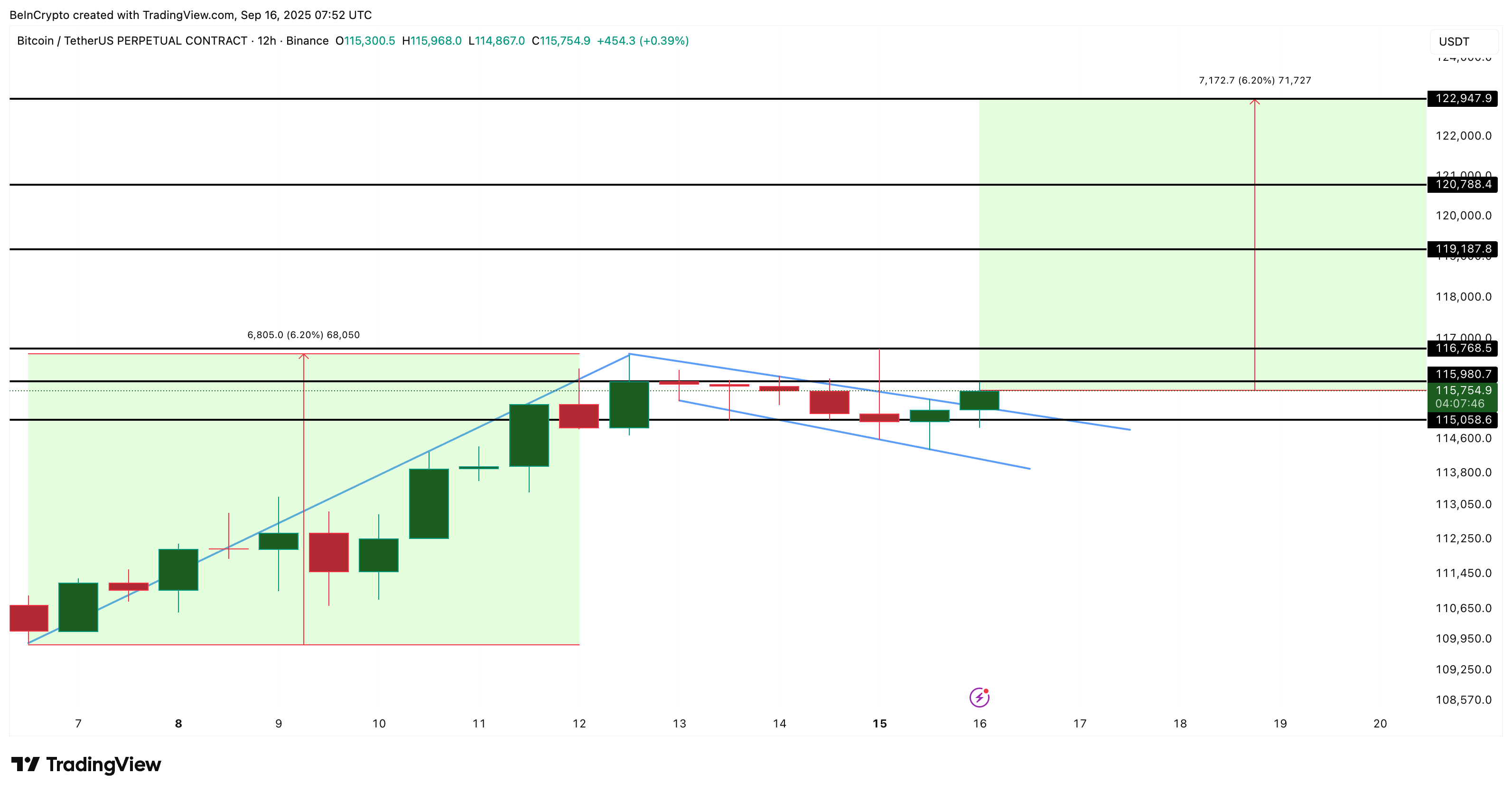 Ang chart pattern na ito ay isang bull flag, isang classic na continuation signal. Kamakailan lang naabot ng Bitcoin ang $115,900 sa 12-hour chart, na nag-set ng stage para sa posibleng breakout, bago bumalik sa $115,700.