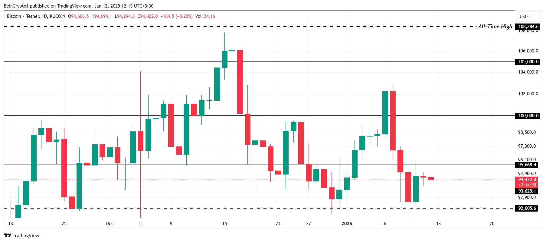 Ang Bitcoin ay kasalukuyang nasa $94,422, bahagyang mas mababa sa $95,668 resistance level. Ang barrier na ito ang huling balakid bago maabot ng cryptocurrency ang $100,000 mark. Kung mabasag ang resistance na ito, maaaring magdulot ito ng panibagong bullish momentum, na magdadala sa BTC na mas malapit sa psychological milestone na ito.