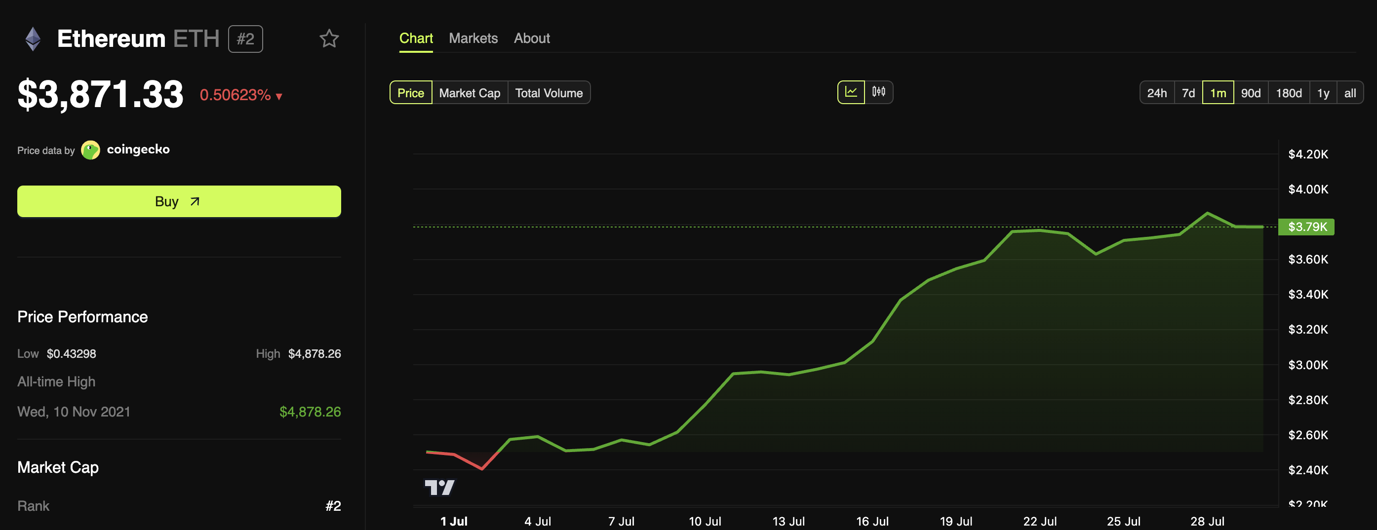 Dumating ang valuation na ito kasabay ng kapansin-pansing bullish rally ng ETH. Tumaas ang presyo nito ng 57% nitong nakaraang buwan, na mas mataas pa sa 10% na pagtaas ng Bitcoin (BTC) sa parehong panahon.