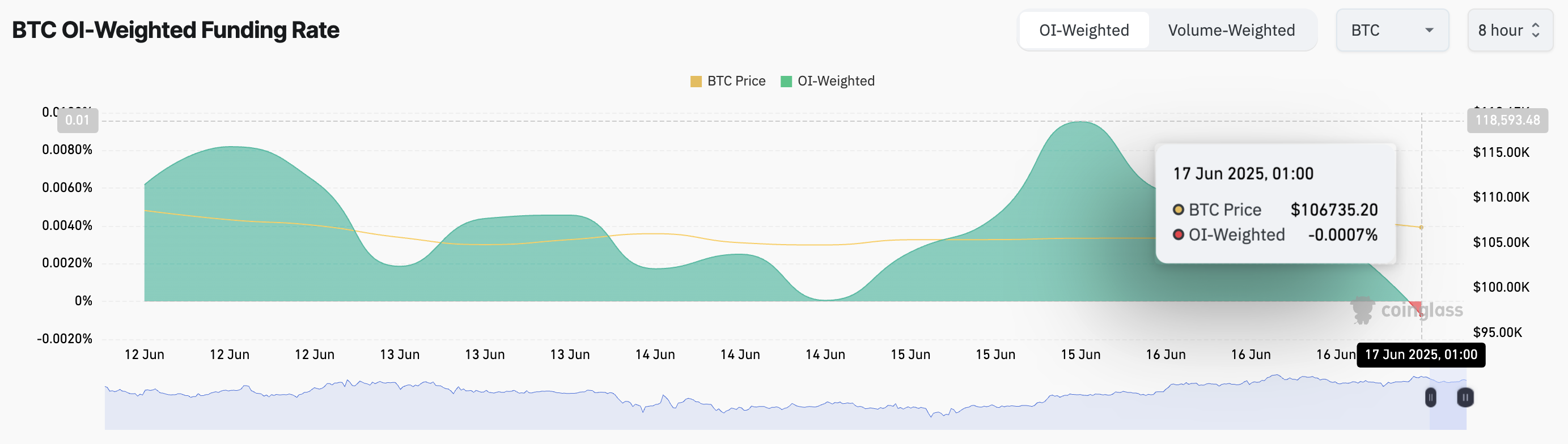 Habang tumaas ng bahagyang 1% ang BTC ngayon, nagbabala ang derivatives market. Muling naging negative ang funding rates, na nagpapakita ng muling bearish sentiment sa mga perpetual futures traders. Ayon sa Coinglass, kasalukuyang nasa 0.0007% ito.