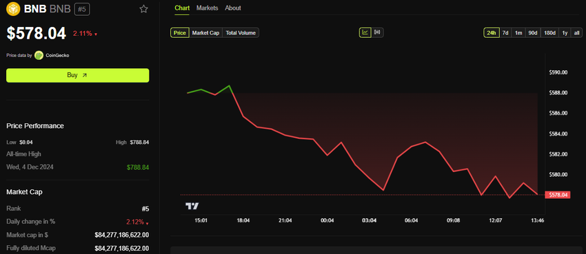 Karaniwan na bullish ang deflationary mechanisms, pero ang market reaction ay medyo malamig. Bumaba ng 2.11% ang presyo ng BNB sa nakaraang 24 oras, na nasa $578.04 sa kasalukuyan.