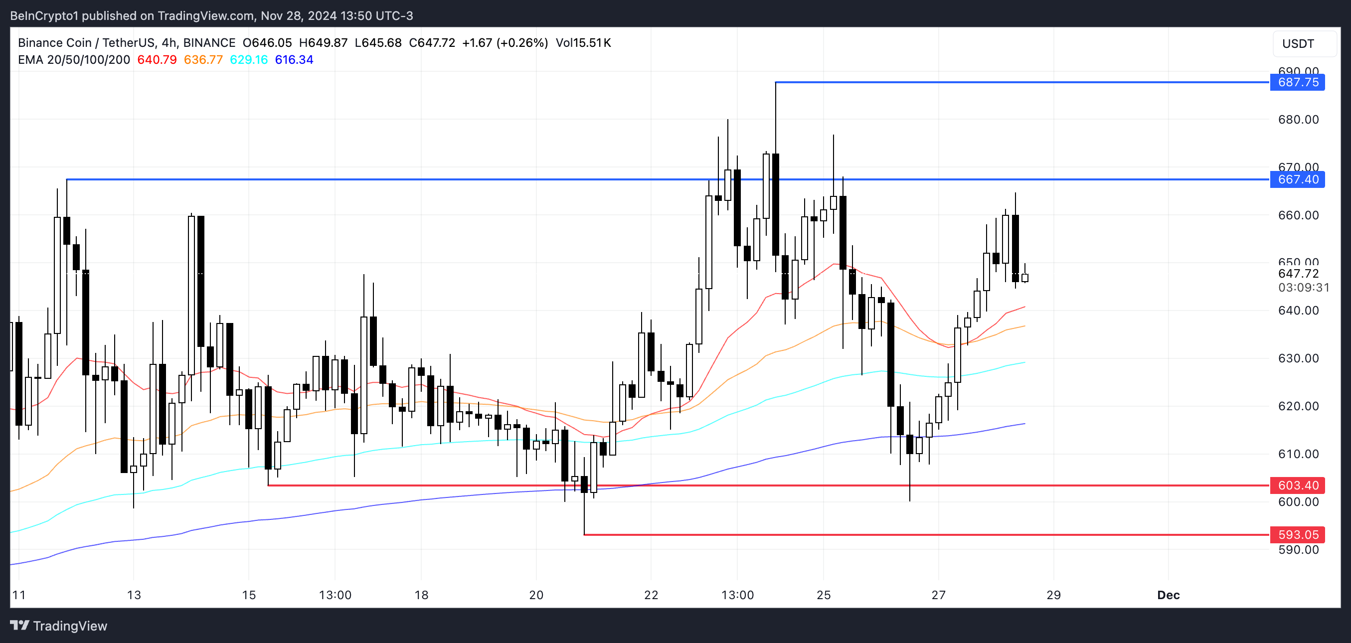 Ang EMA lines ng BNB ay kasalukuyang nagpapakita ng bullish setup, kung saan ang short-term EMAs ay nasa itaas ng long-term ones. Ang alignment na ito ay nagpapahiwatig na nananatili ang uptrend sa ngayon, at kung makabawi ang BNB price sa momentum, maaari nitong ma-break ang key resistances sa $667 at $687.