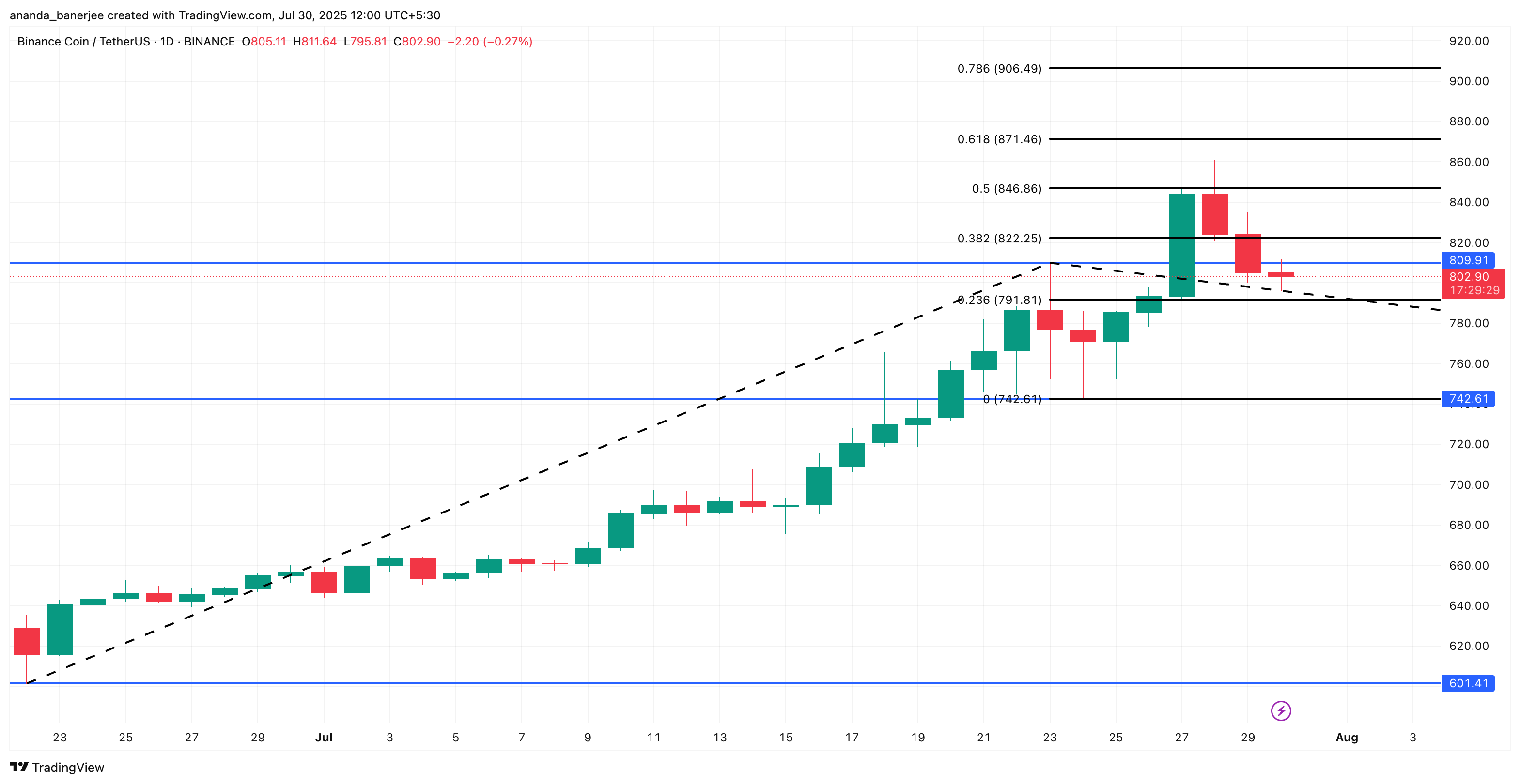 Ang matinding pag-angat ng BNB sa bagong all-time high na $858 ilang araw lang ang nakalipas ay mabilis na humupa, at ngayon ang coin ay nasa paligid ng $800, bumaba ng halos 7% sa nakaraang 24 oras. Dahil sa mabilis na pagbagsak, nagtataka ang mga trader kung malapit na bang maabot ang bagong all-time high ng BNB, o kung mas pinapahigpit na ng mga seller ang kanilang hawak.