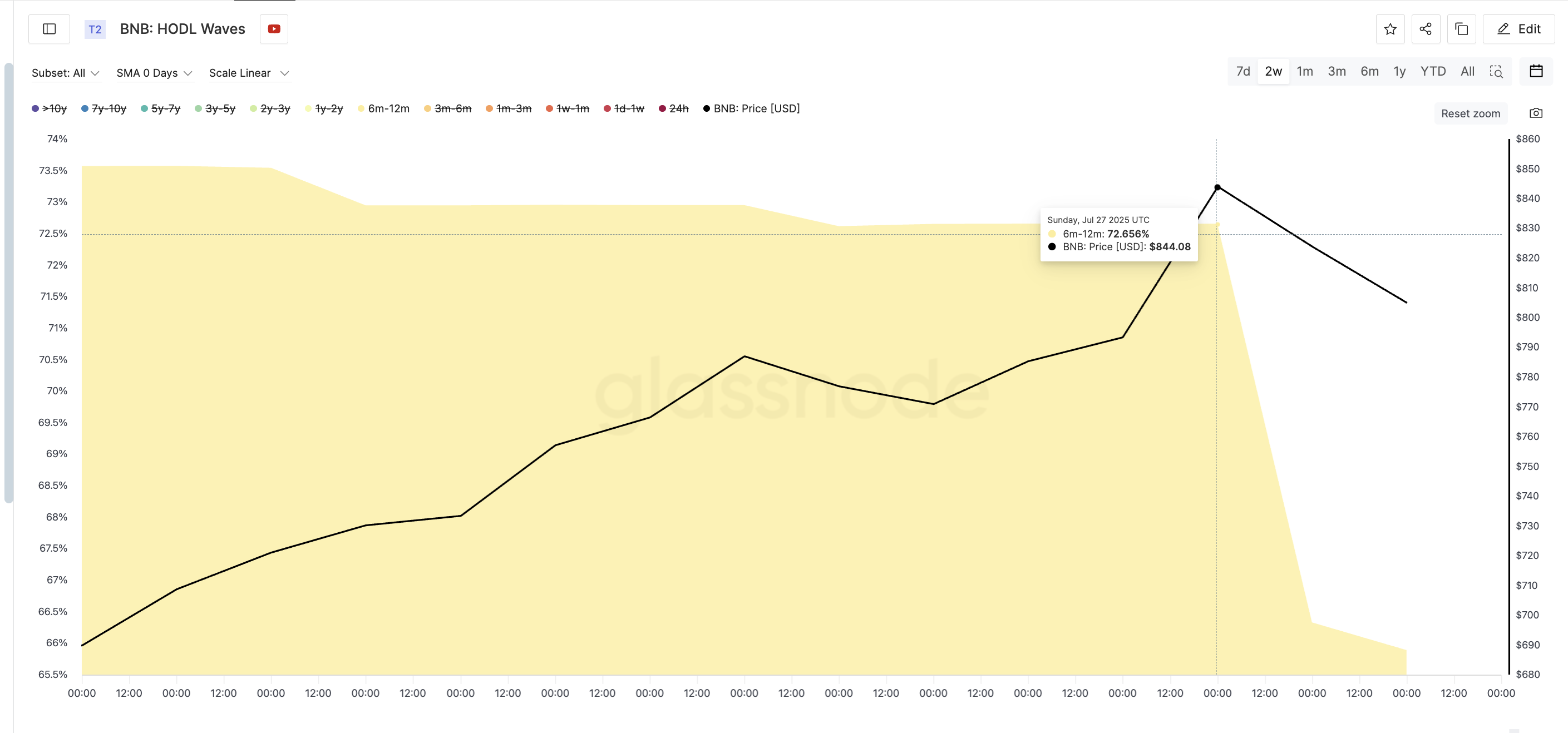 Kapag ang mga coins ay hawak ng 6–12 buwan, kadalasan ang grupong ito ay nagsisilbing matatag na kamay na tumutulong sa pagpapanatili ng trend. Pero sa nakaraang tatlong araw, ang HODL wave para sa cohort na ito ay bumagsak nang malaki, mula 72.65% ng supply noong July 27 hanggang 65.88% sa kasalukuyan.