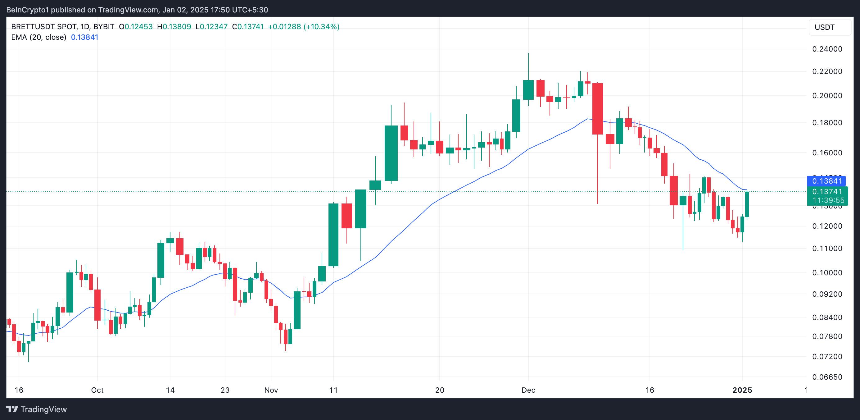 Ang aktibidad ng whale na ito ay nagdulot ng pagtaas sa demand at presyo ng BRETT sa nakaraang 24 oras. Ang meme coin ay nagte-trade sa $0.137 sa oras ng pagsulat, na may 20% na pagtaas sa panahong iyon. Ang assessment ng BeInCrypto sa BRETT/USD one-day chart ay nagpakita na ang meme coin ay posibleng magpatuloy sa pag-akyat sa maikling panahon.